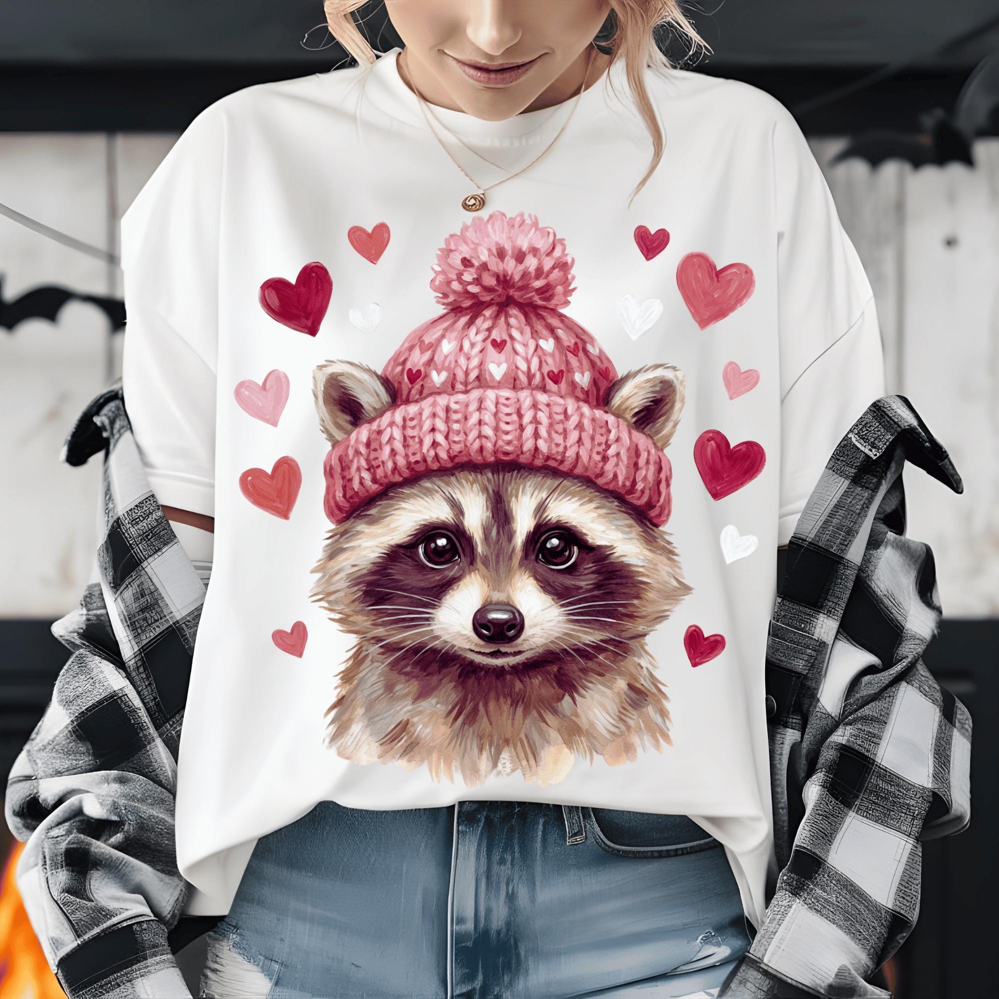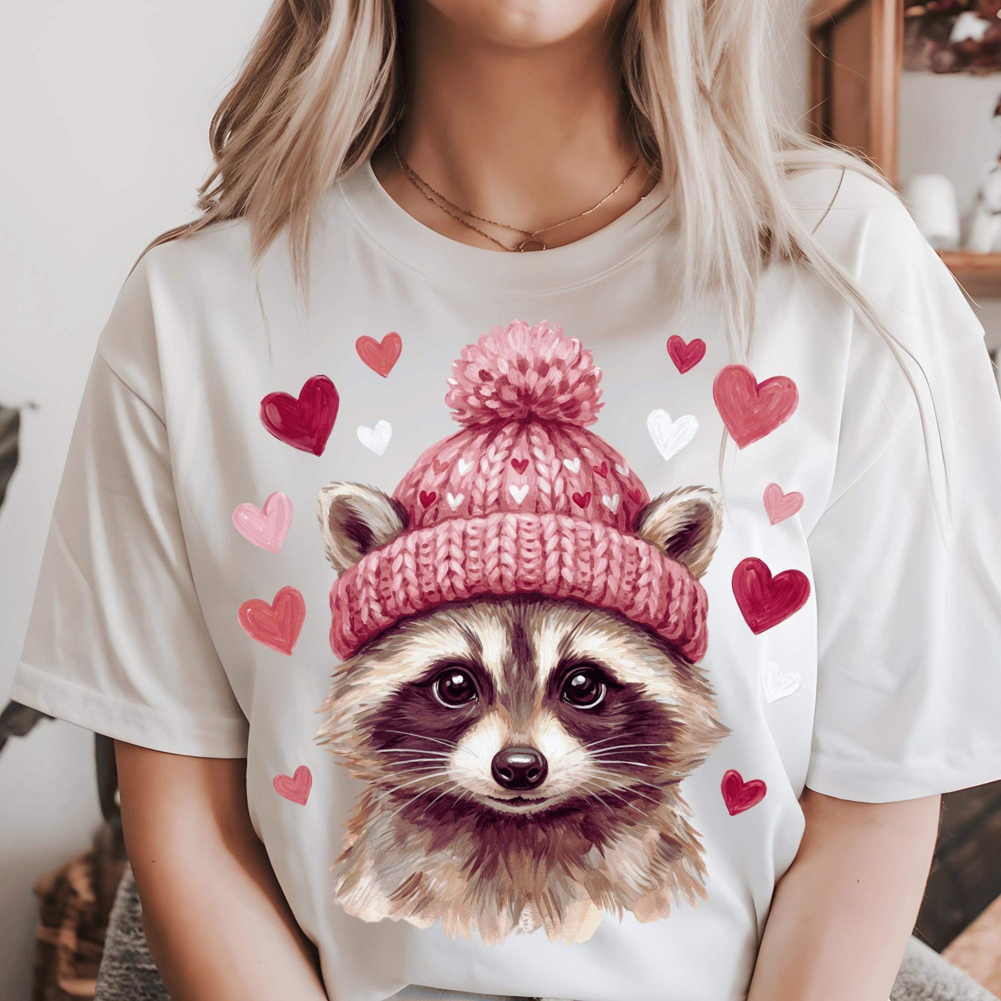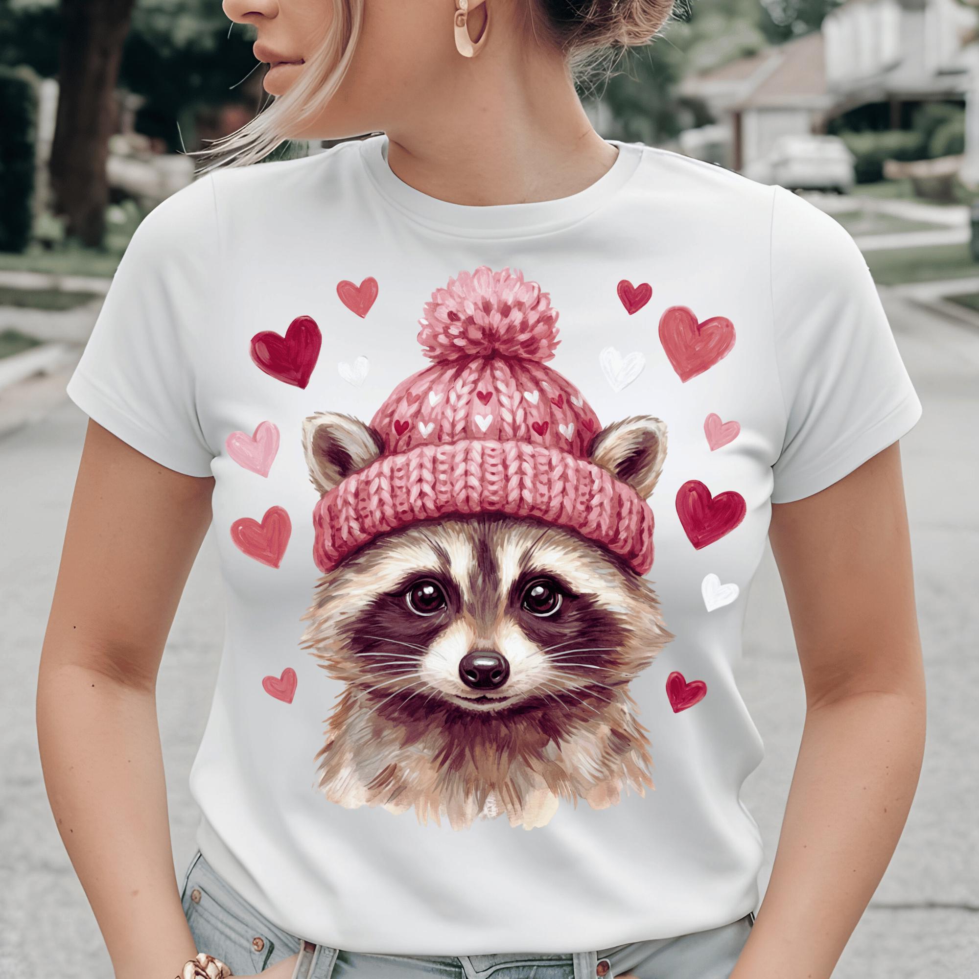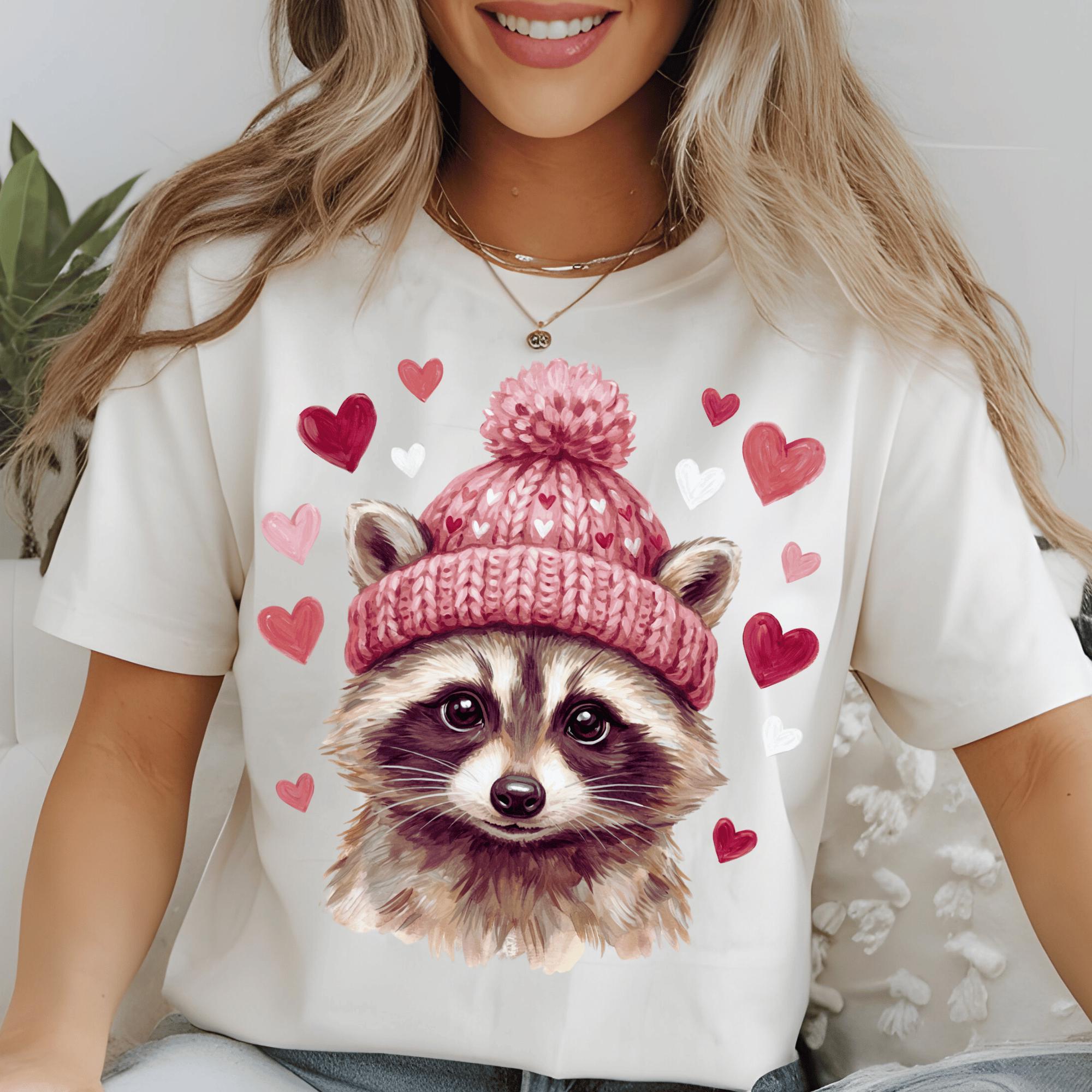Adorable Valentine raccoon illustration wearing a heart-patterned winter hat, surrounded by hearts. Perfect for Valentine’s Day shirts, gifts, and cute animal-themed designs that customers love.