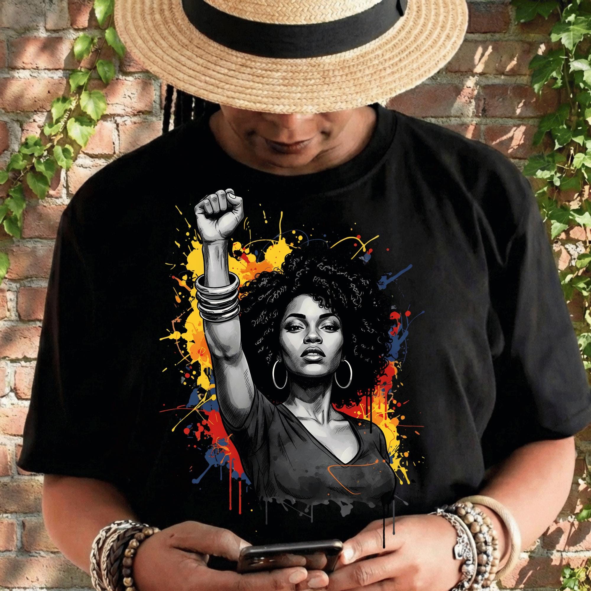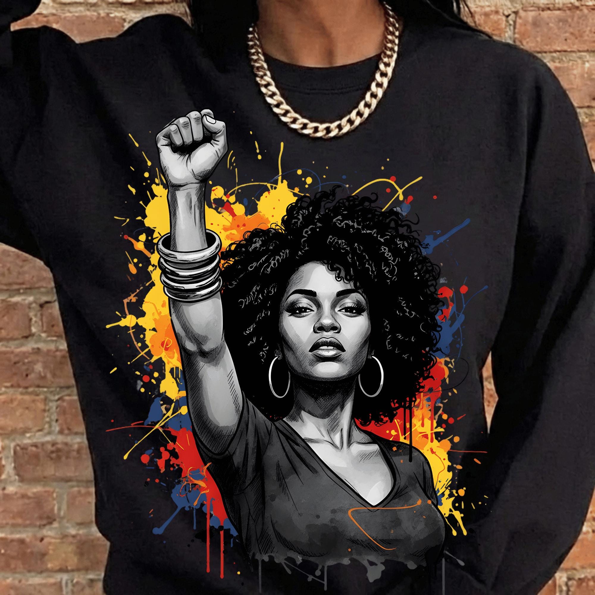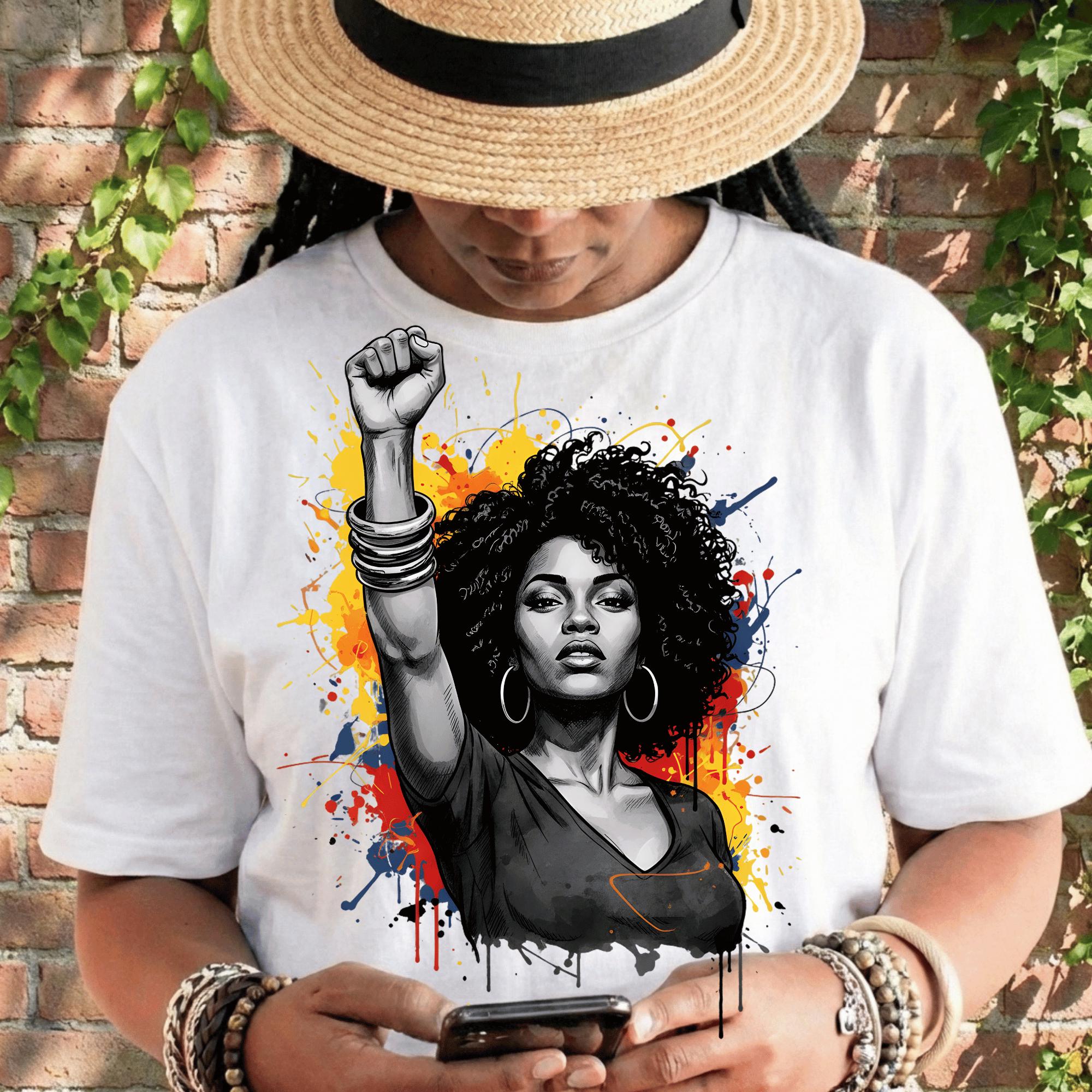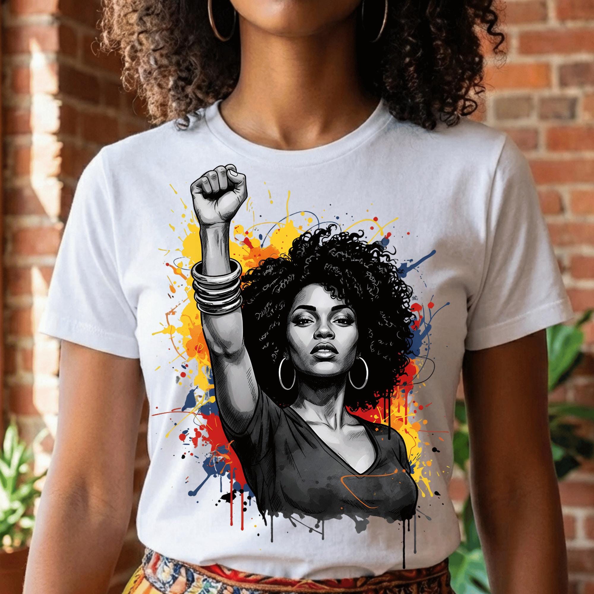 Celebrate strength, resilience, and empowerment with this bold Black Woman Power design featuring a raised fist and artistic paint-splash background. Perfect for empowerment shirts, Black History Month apparel, wall art, and inspirational projects.
