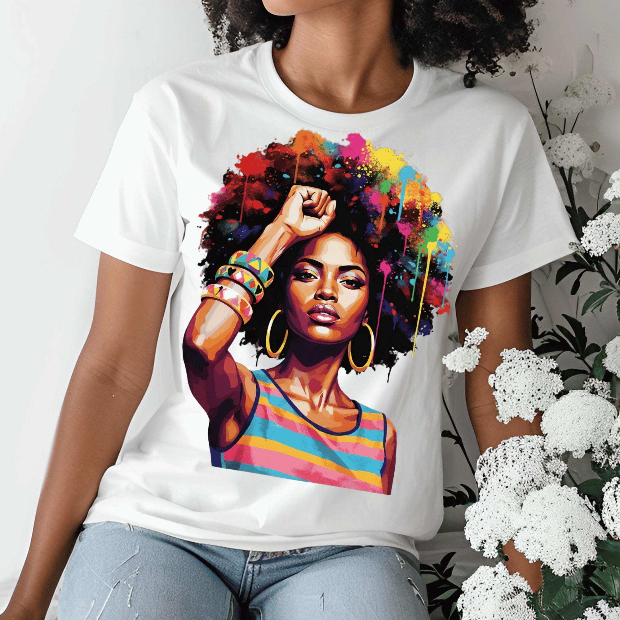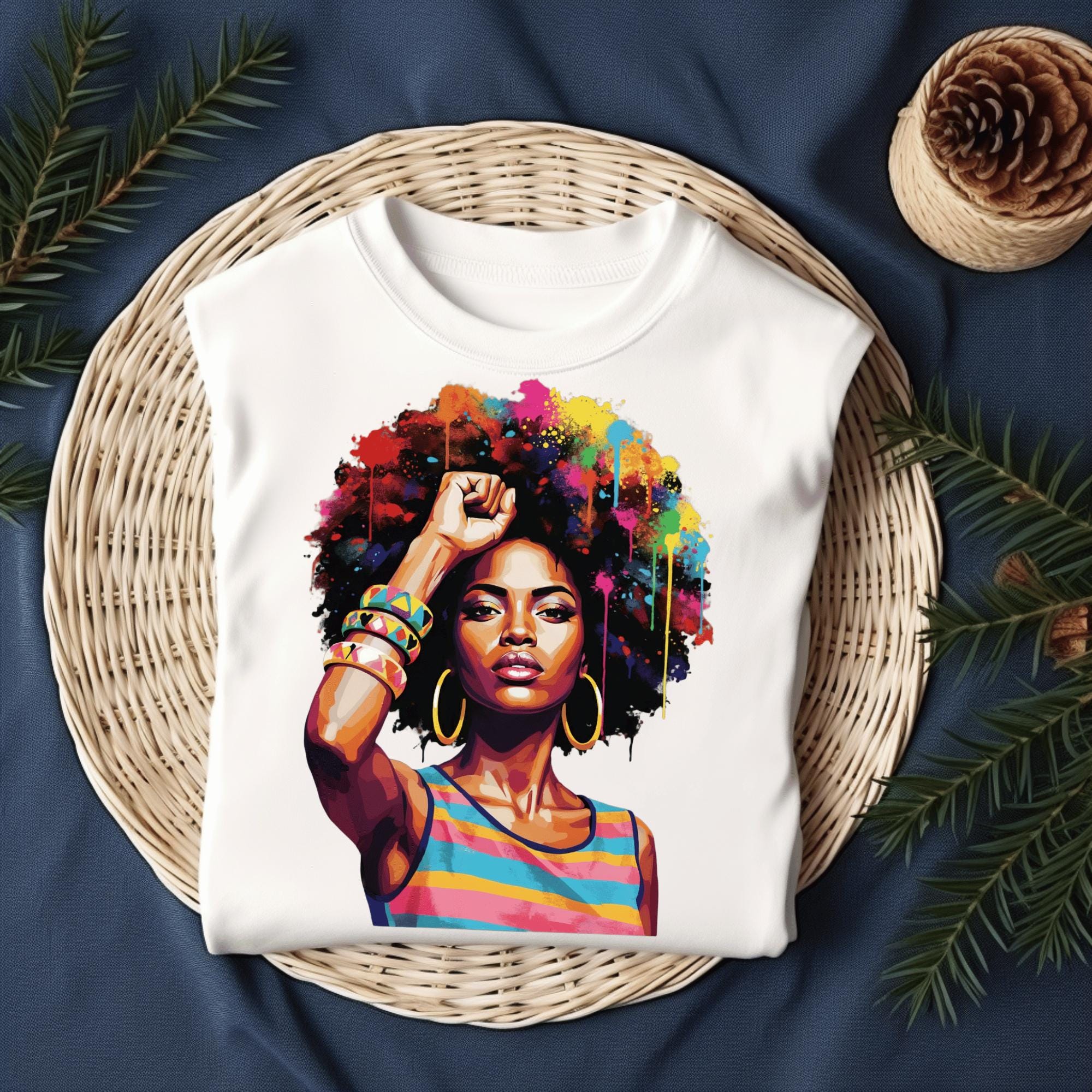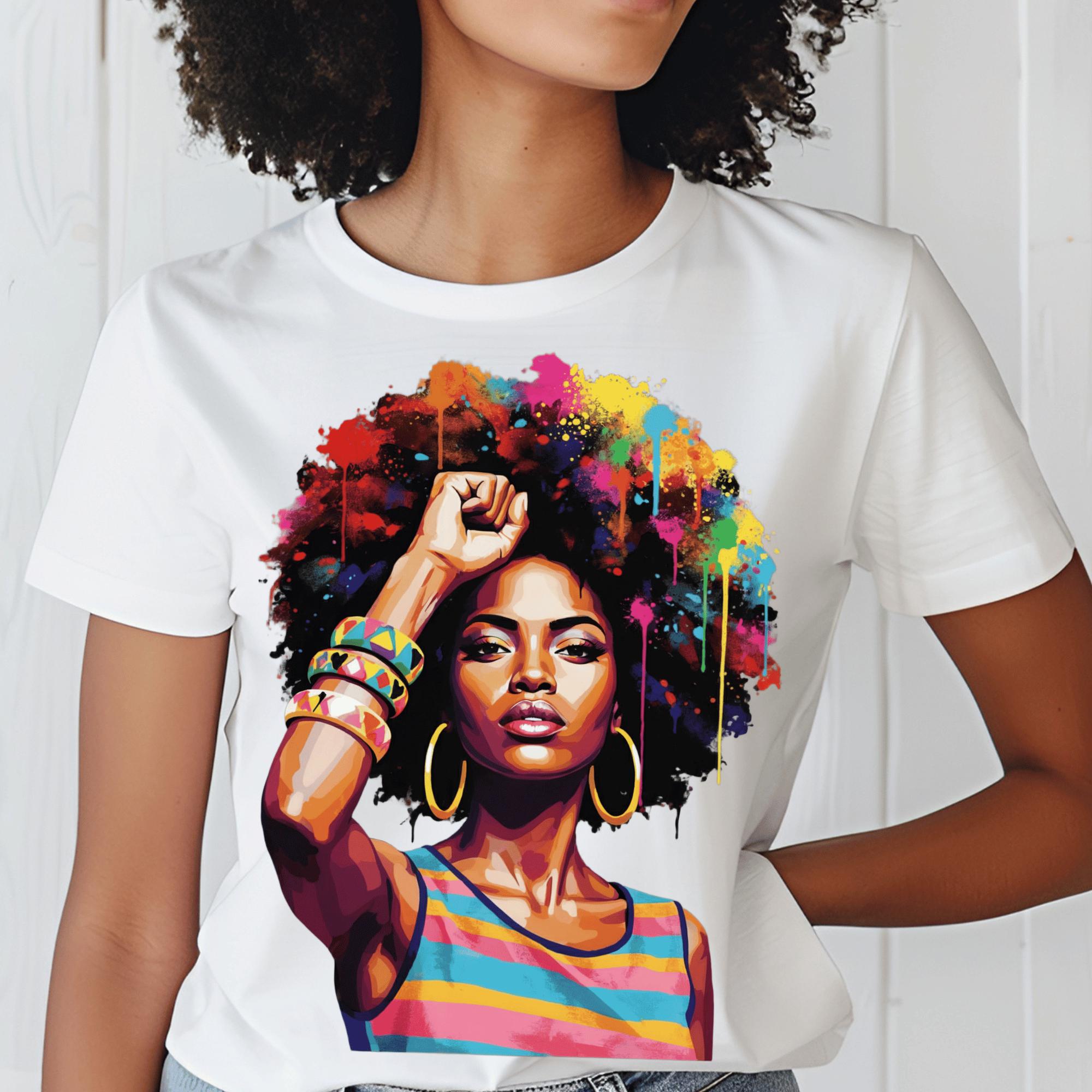 Celebrate strength, resilience, and empowerment with this bold Black Woman Power design featuring a raised fist and artistic paint-splash background. Perfect for empowerment shirts, Black History Month apparel, wall art, and inspirational projects.