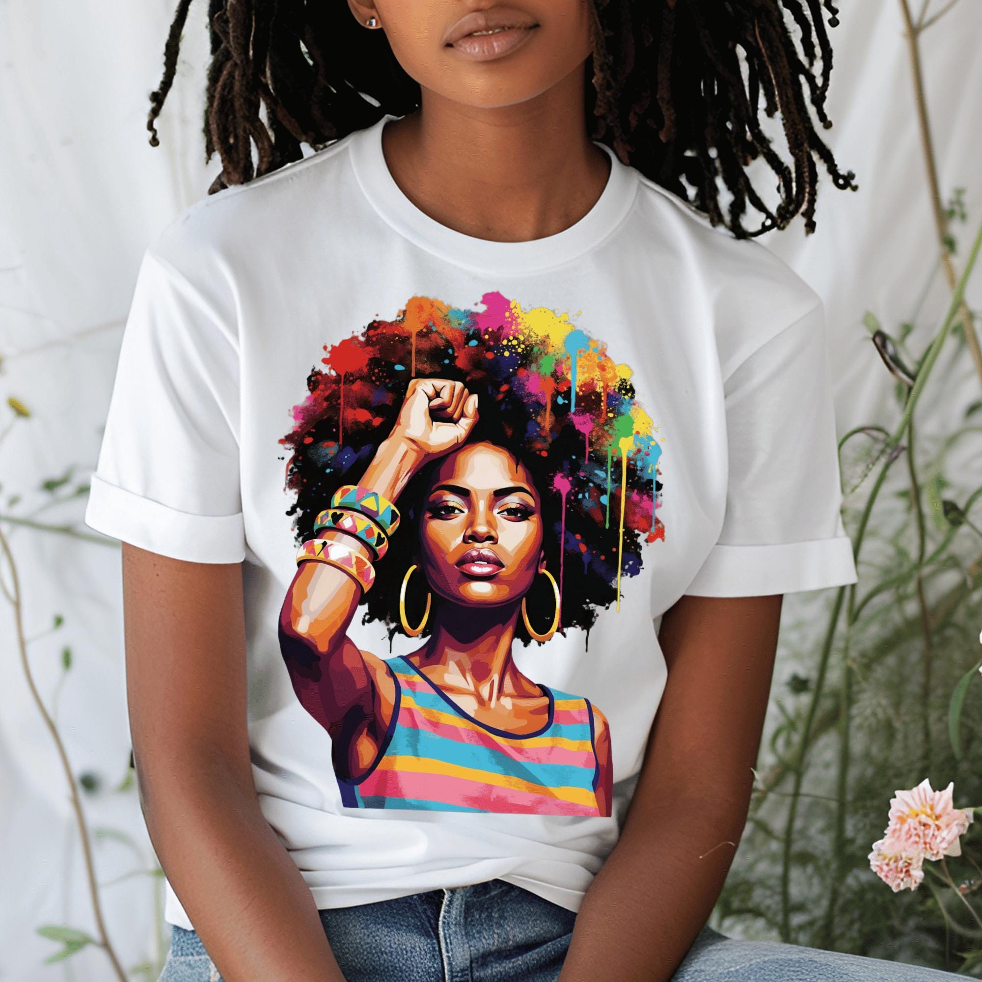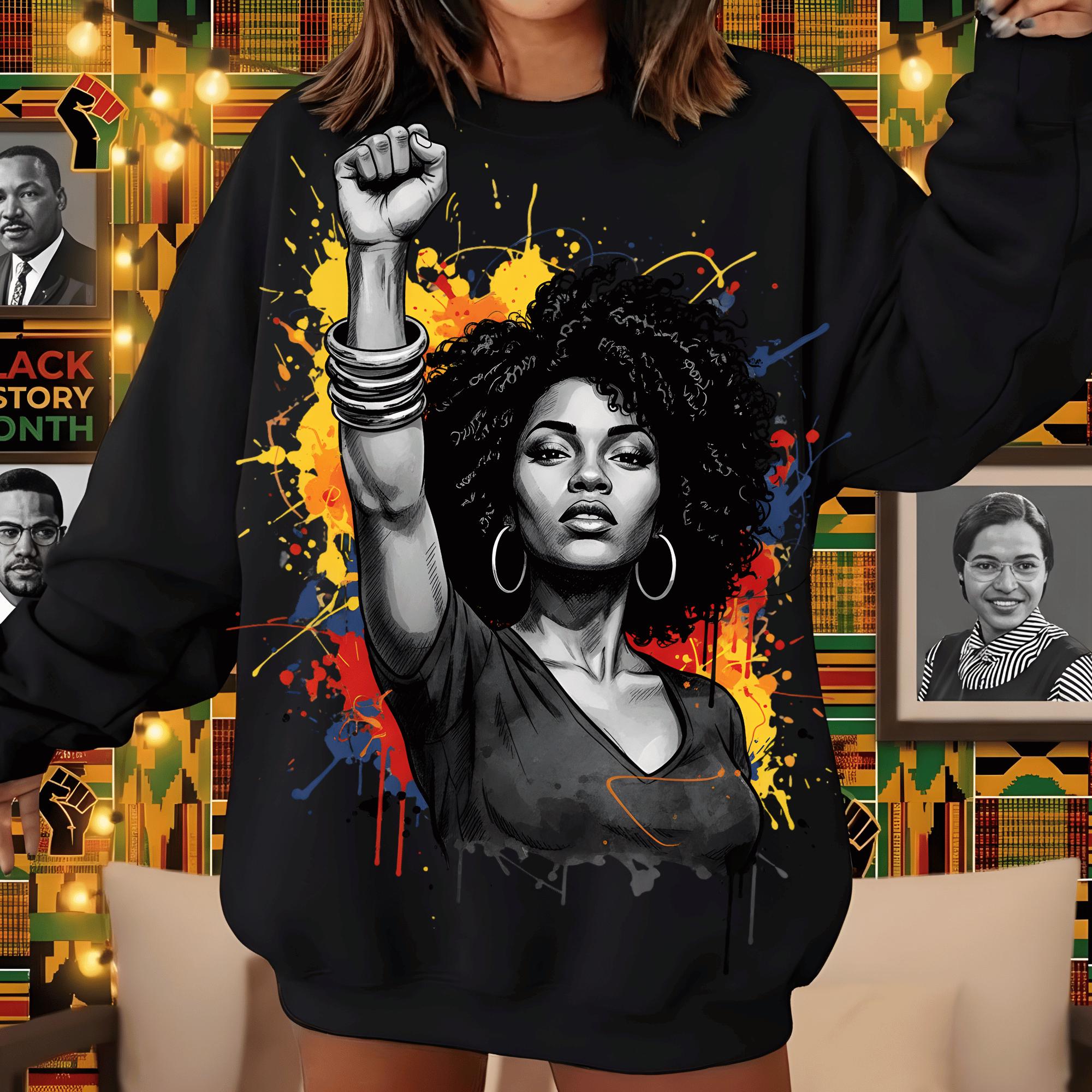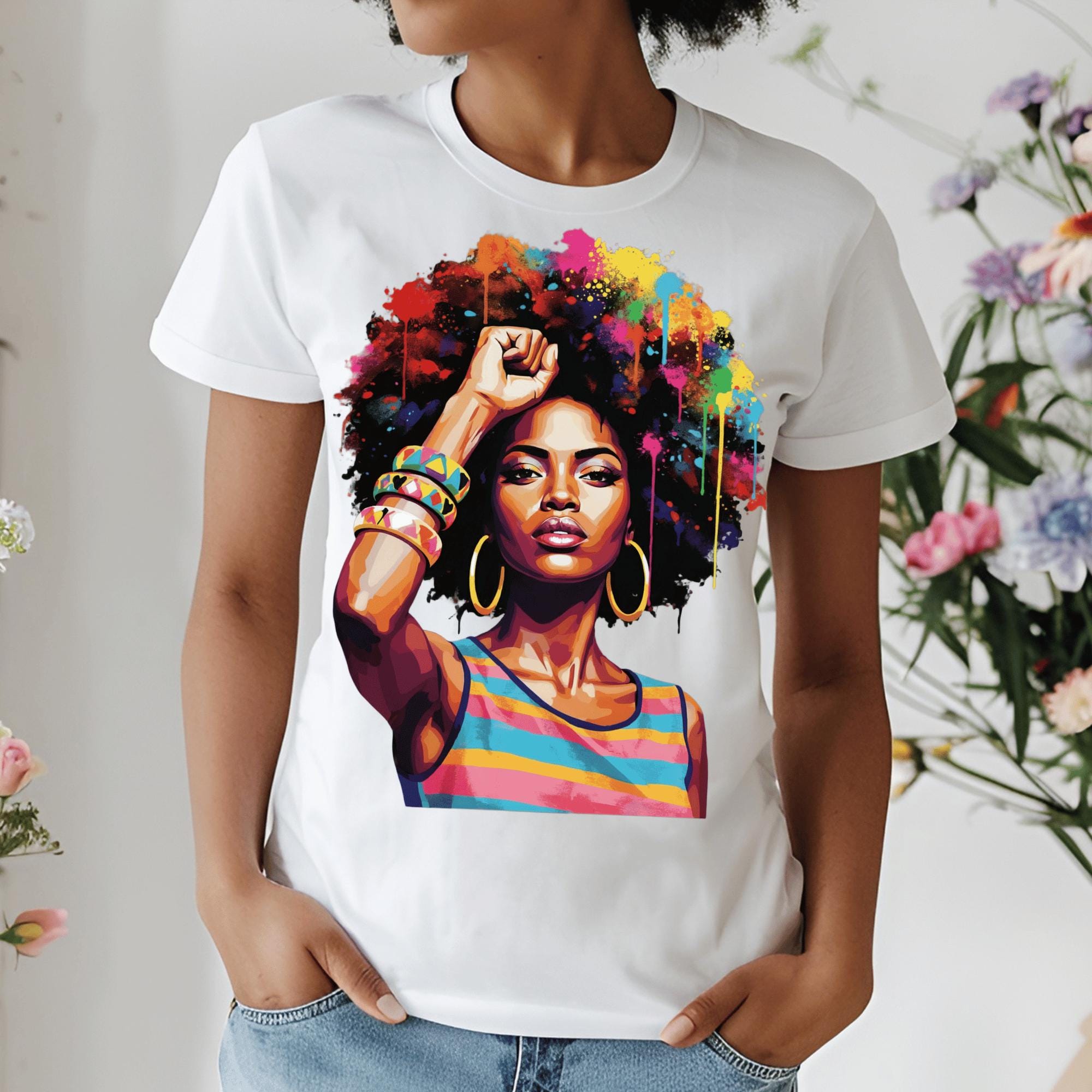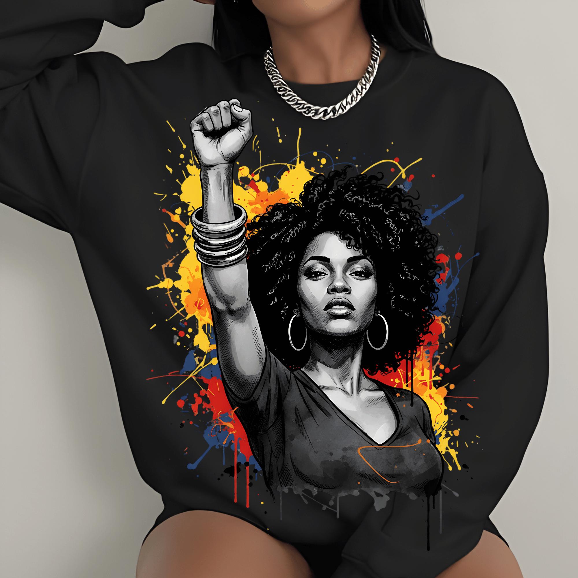 Celebrate strength, resilience, and empowerment with this bold Black Woman Power design featuring a raised fist and artistic paint-splash background. Perfect for empowerment shirts, Black History Month apparel, wall art, and inspirational projects.