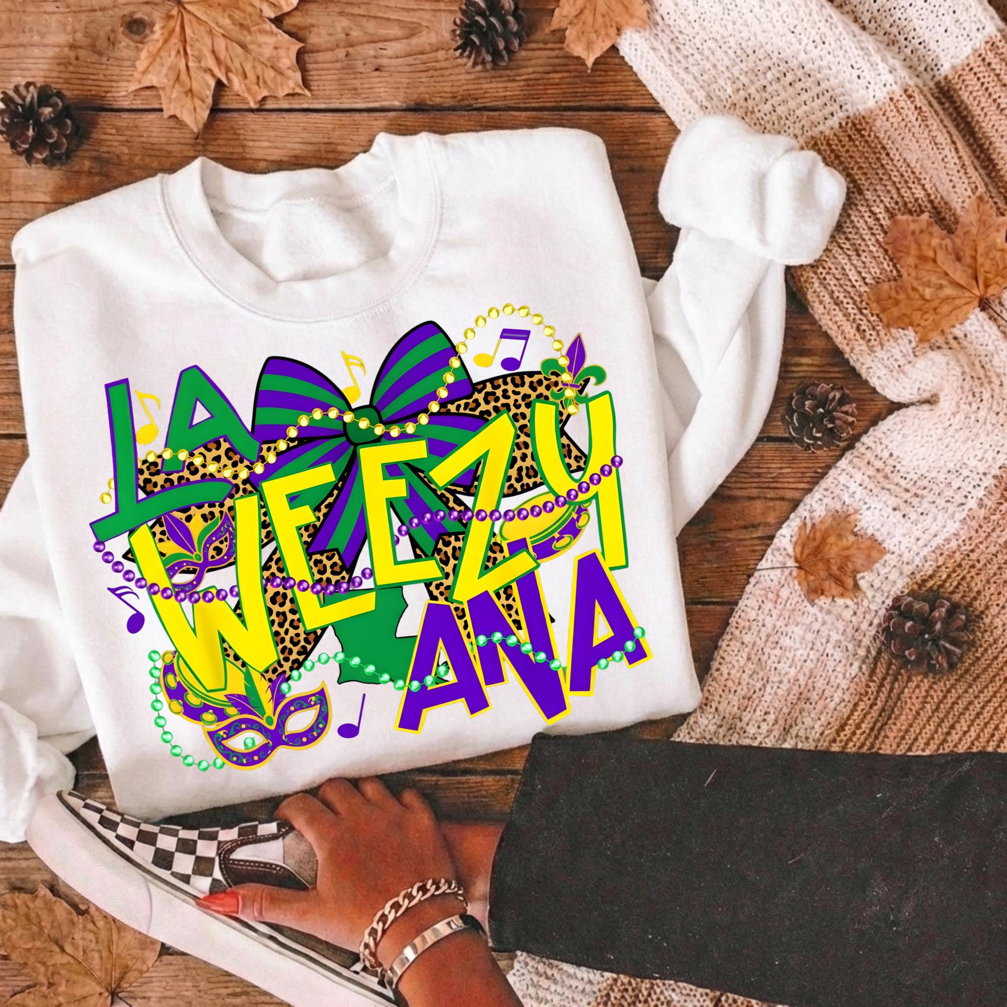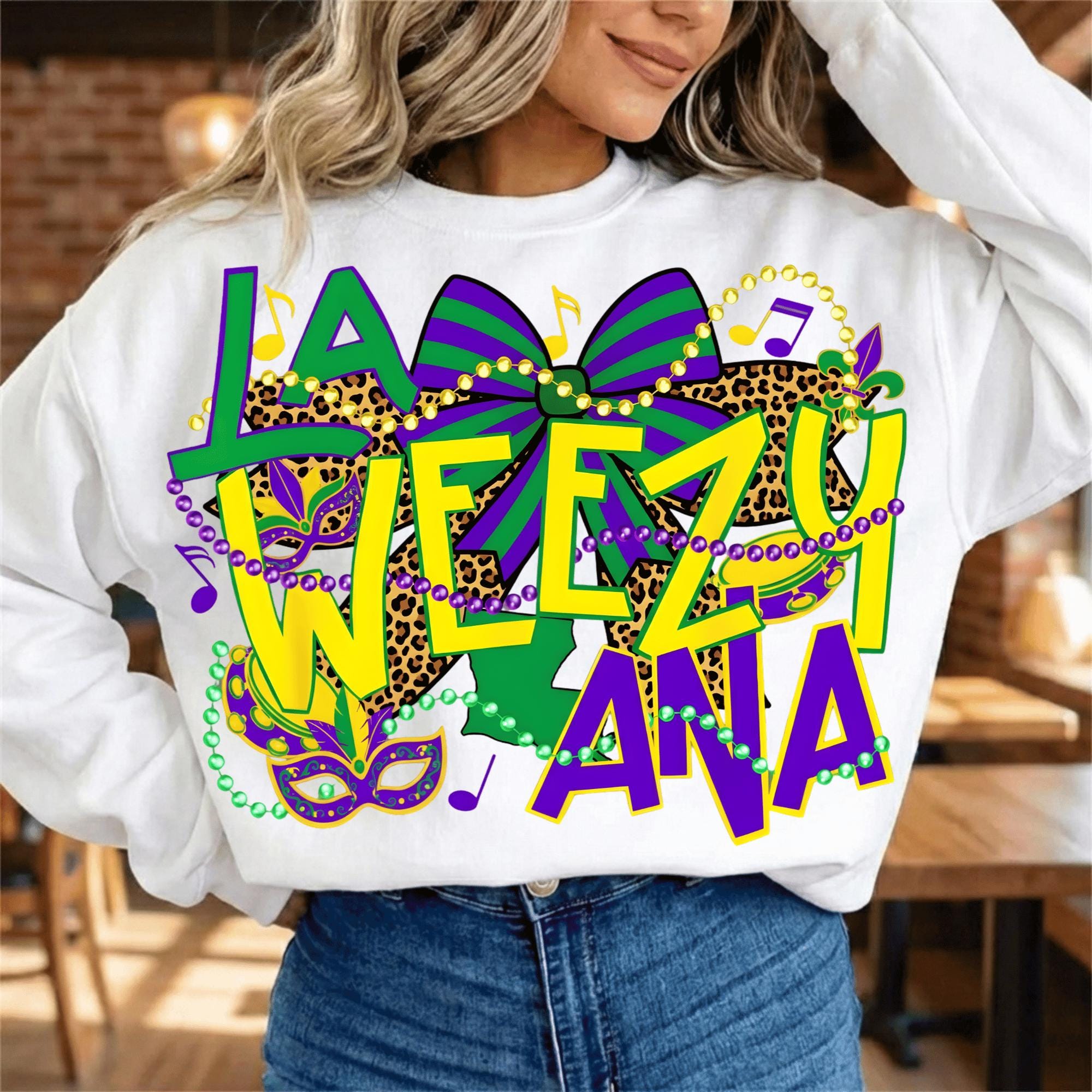 Celebrate Mardi Gras in true Louisiana style with this bold and festive “LA WEZY ANA” Mardi Gras design! 💜💚💛