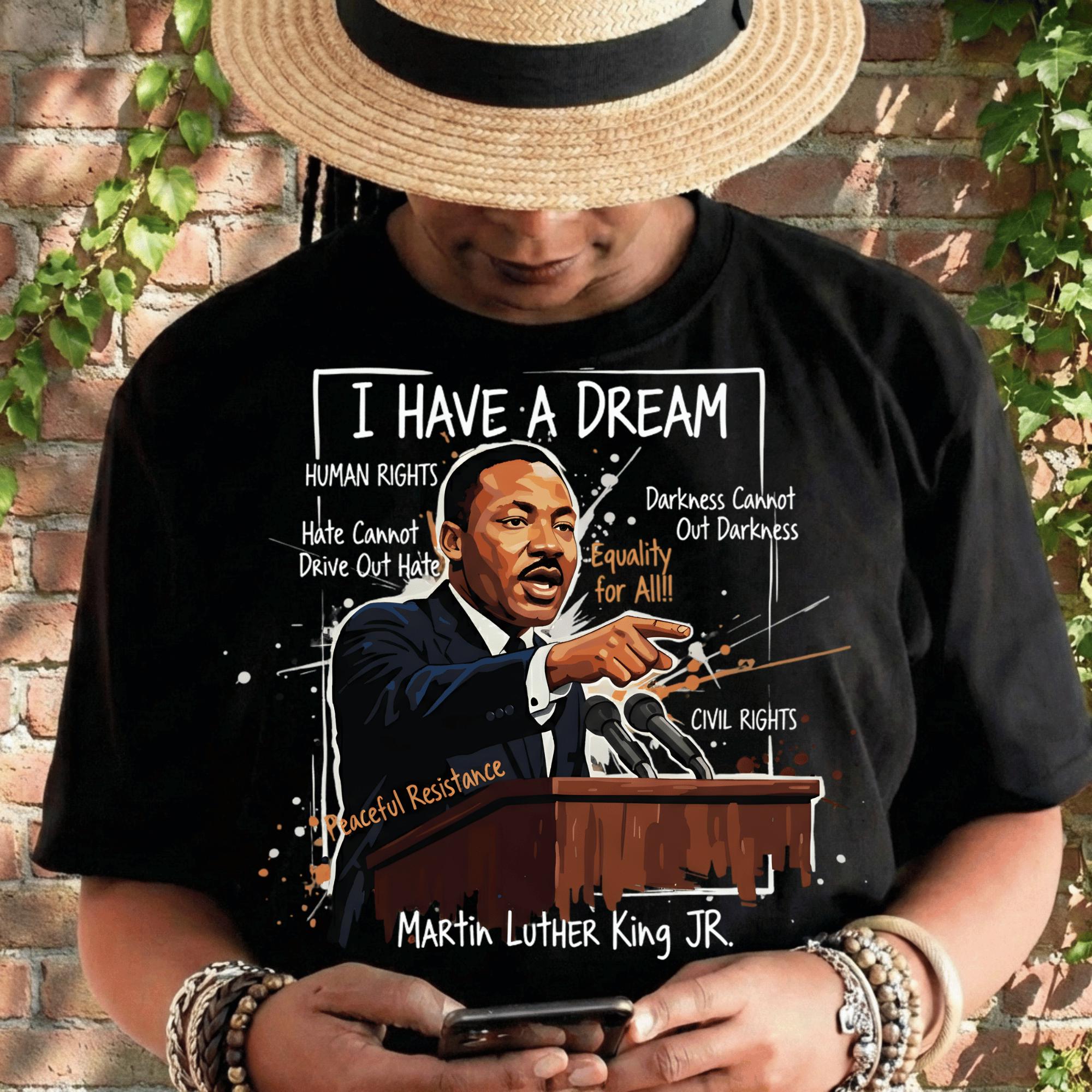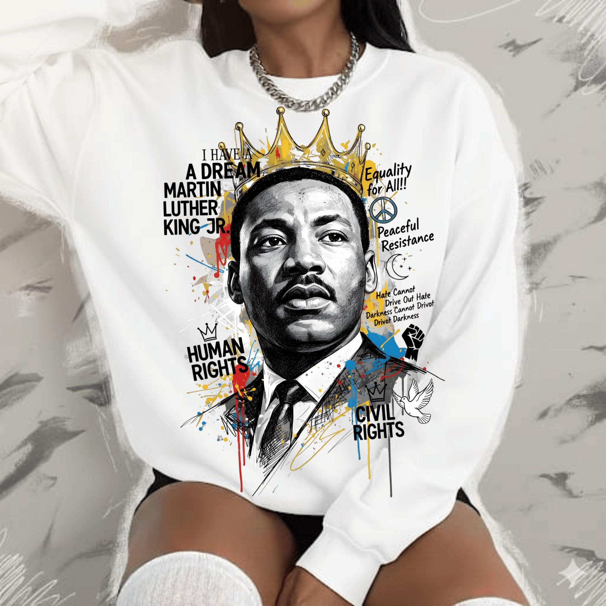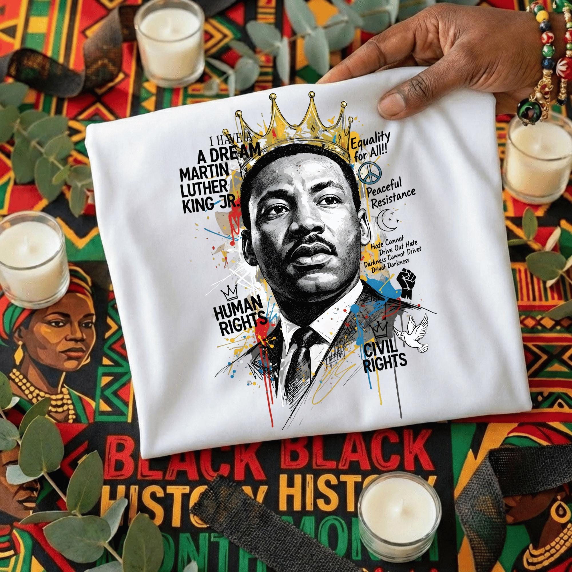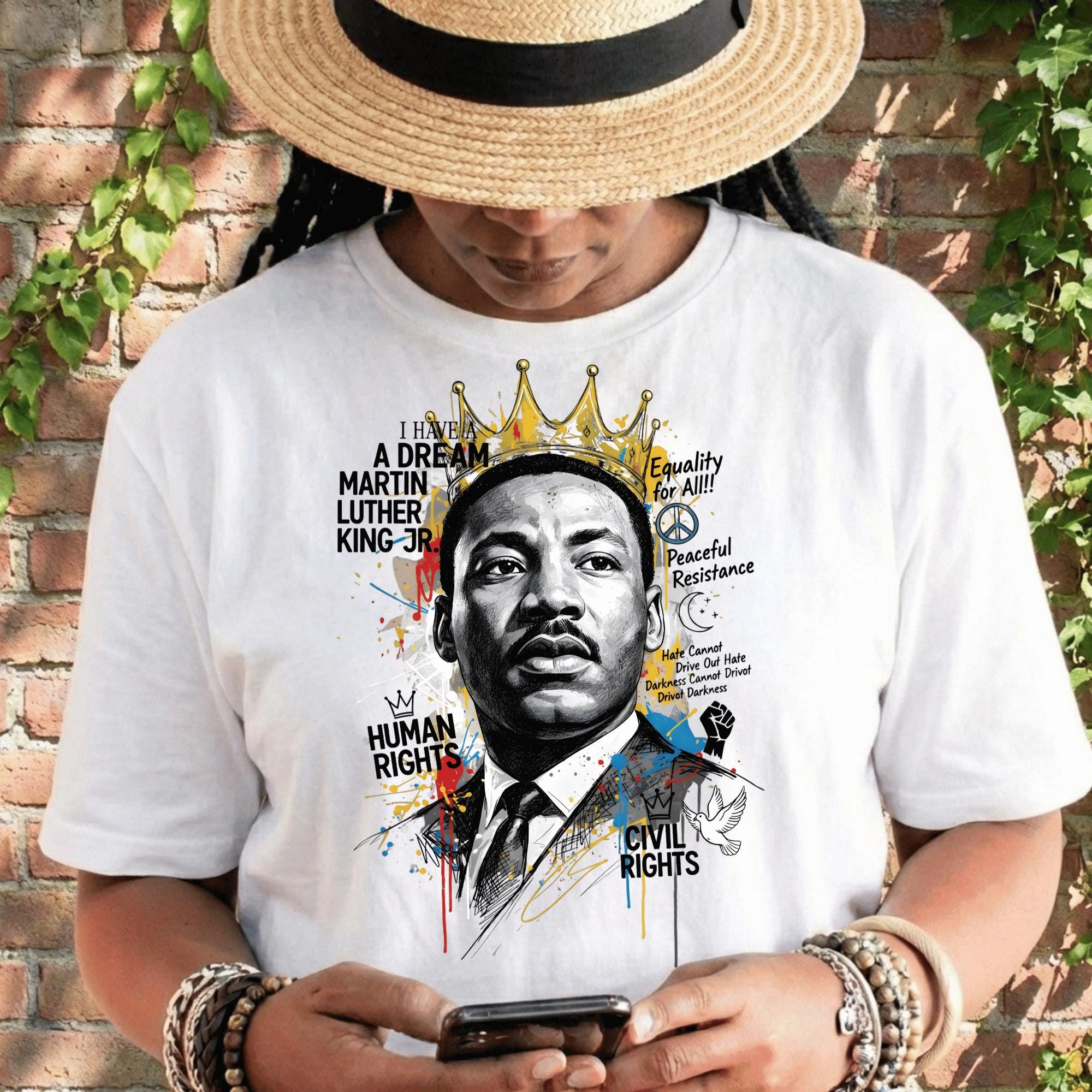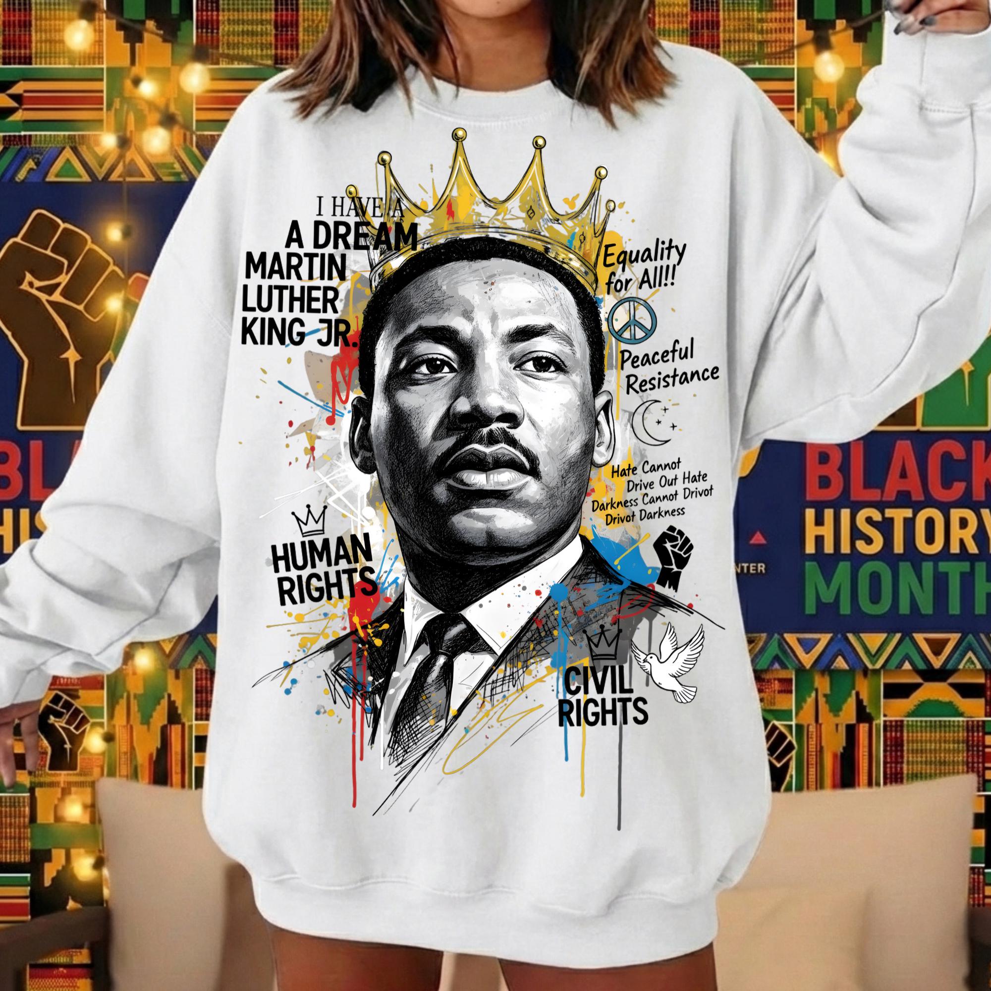 This powerful design features Dr. King crowned in gold—symbolizing dignity, strength, and moral leadership—surrounded by expressive textures, symbols, and phrases tied to his enduring message of equality, peaceful resistance, human rights, and justice. The bold mixed-media style makes this piece both visually commanding and deeply meaningful.