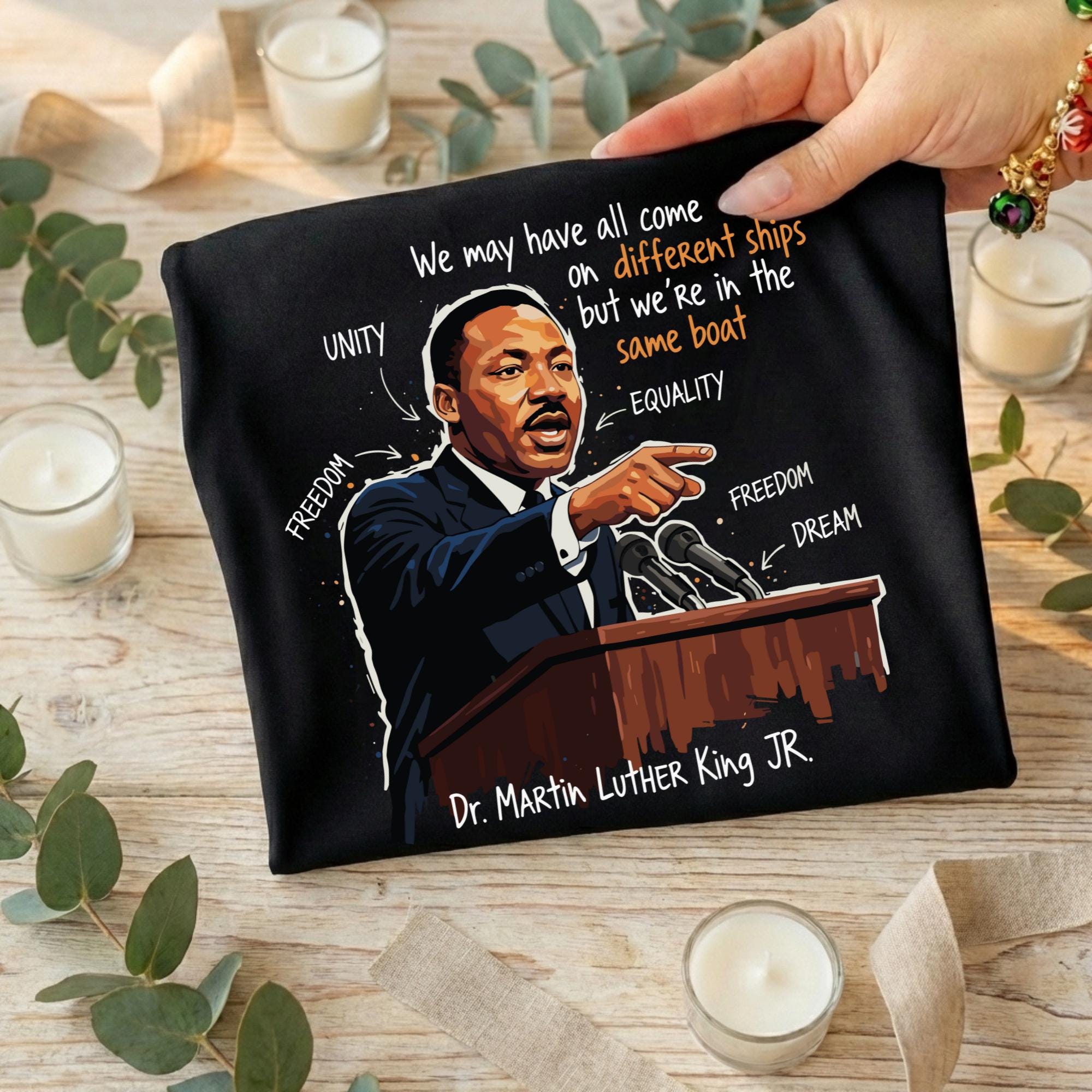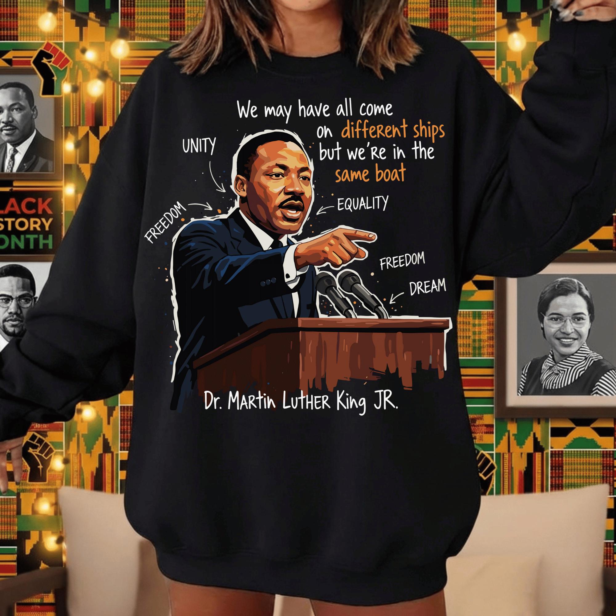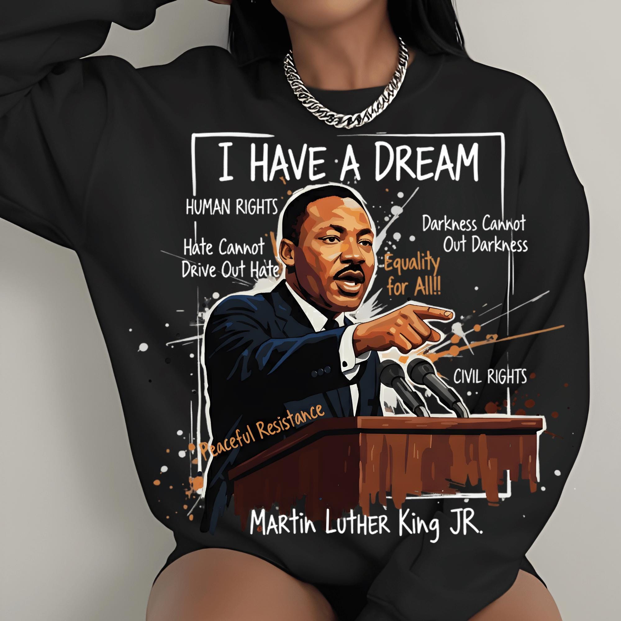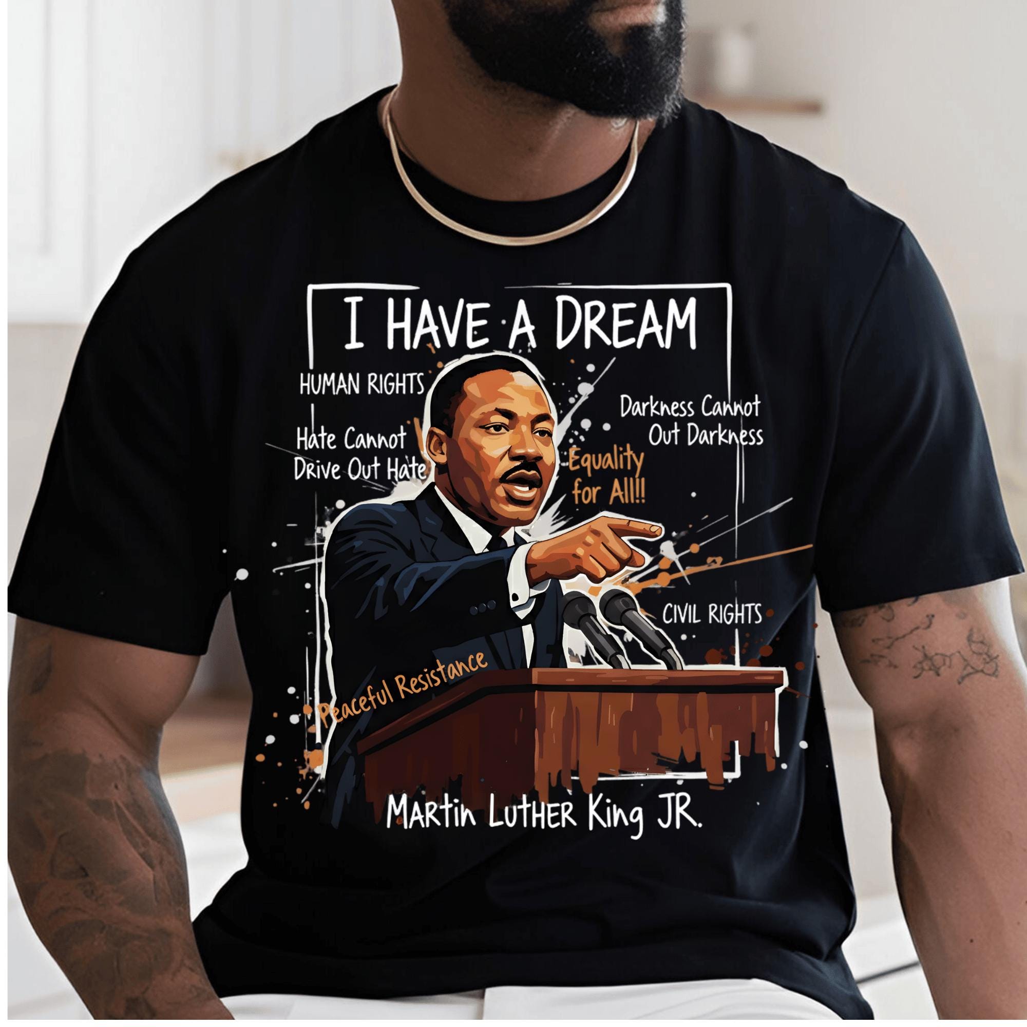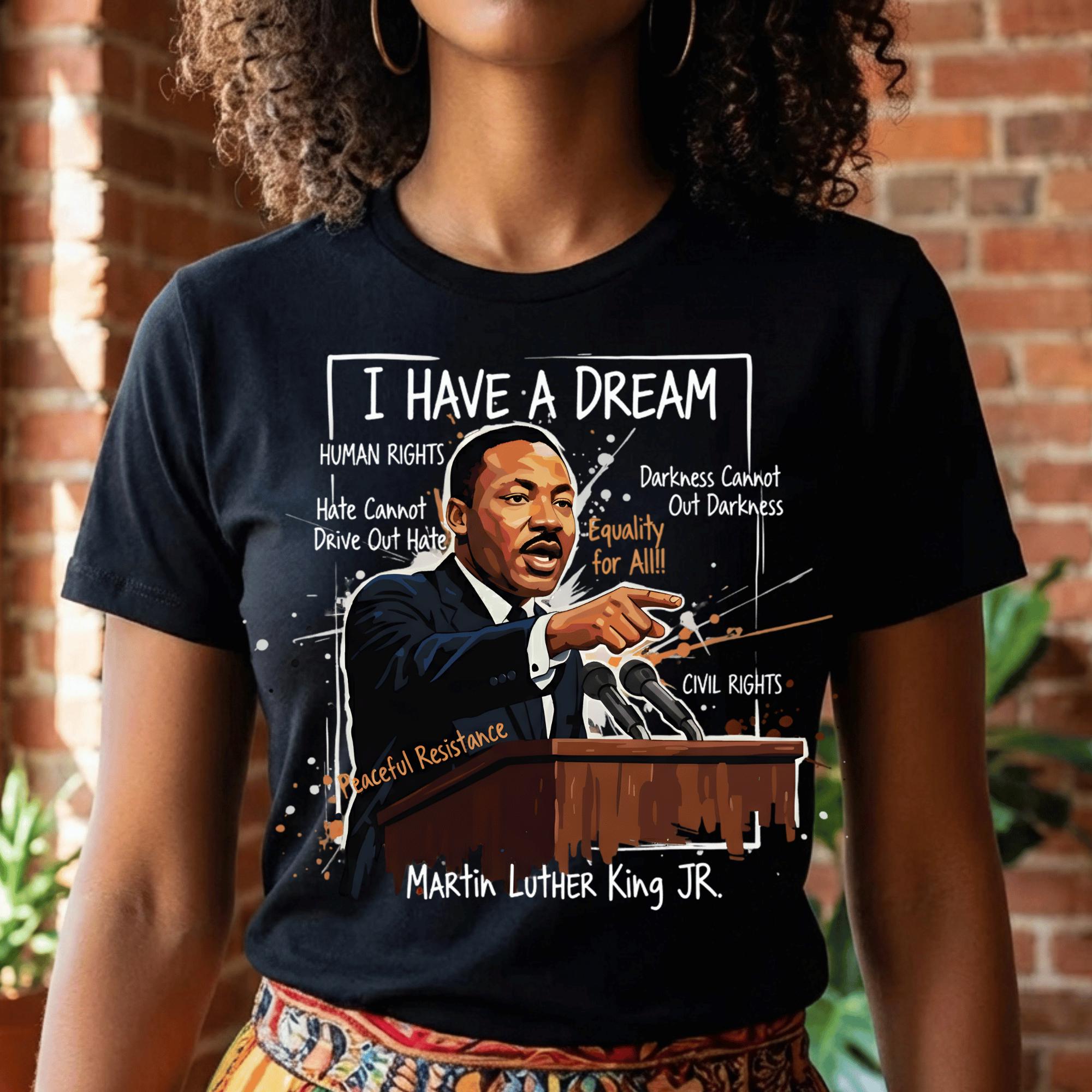 This powerful design features Dr. King crowned in gold—symbolizing dignity, strength, and moral leadership—surrounded by expressive textures, symbols, and phrases tied to his enduring message of equality, peaceful resistance, human rights, and justice. The bold mixed-media style makes this piece both visually commanding and deeply meaningful.