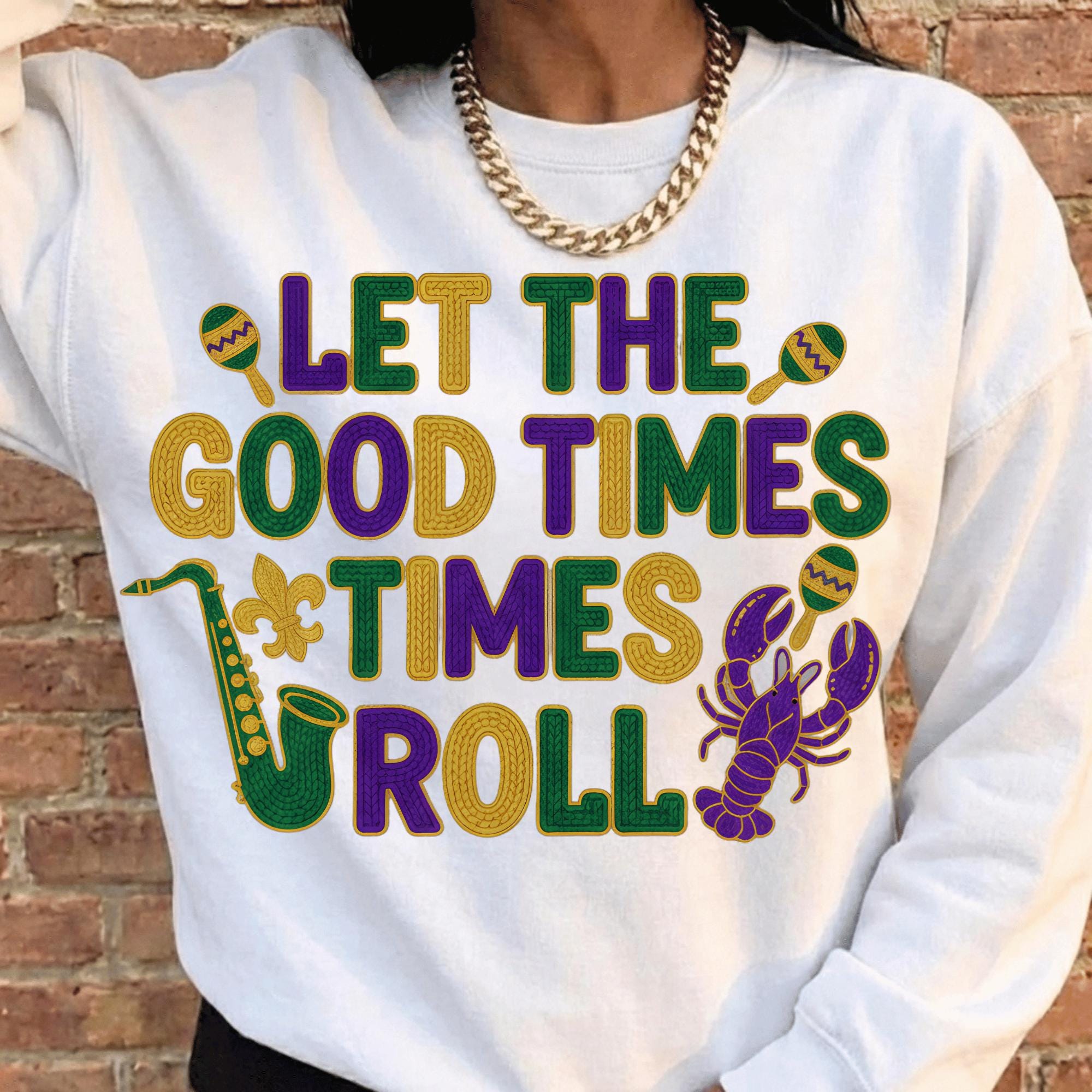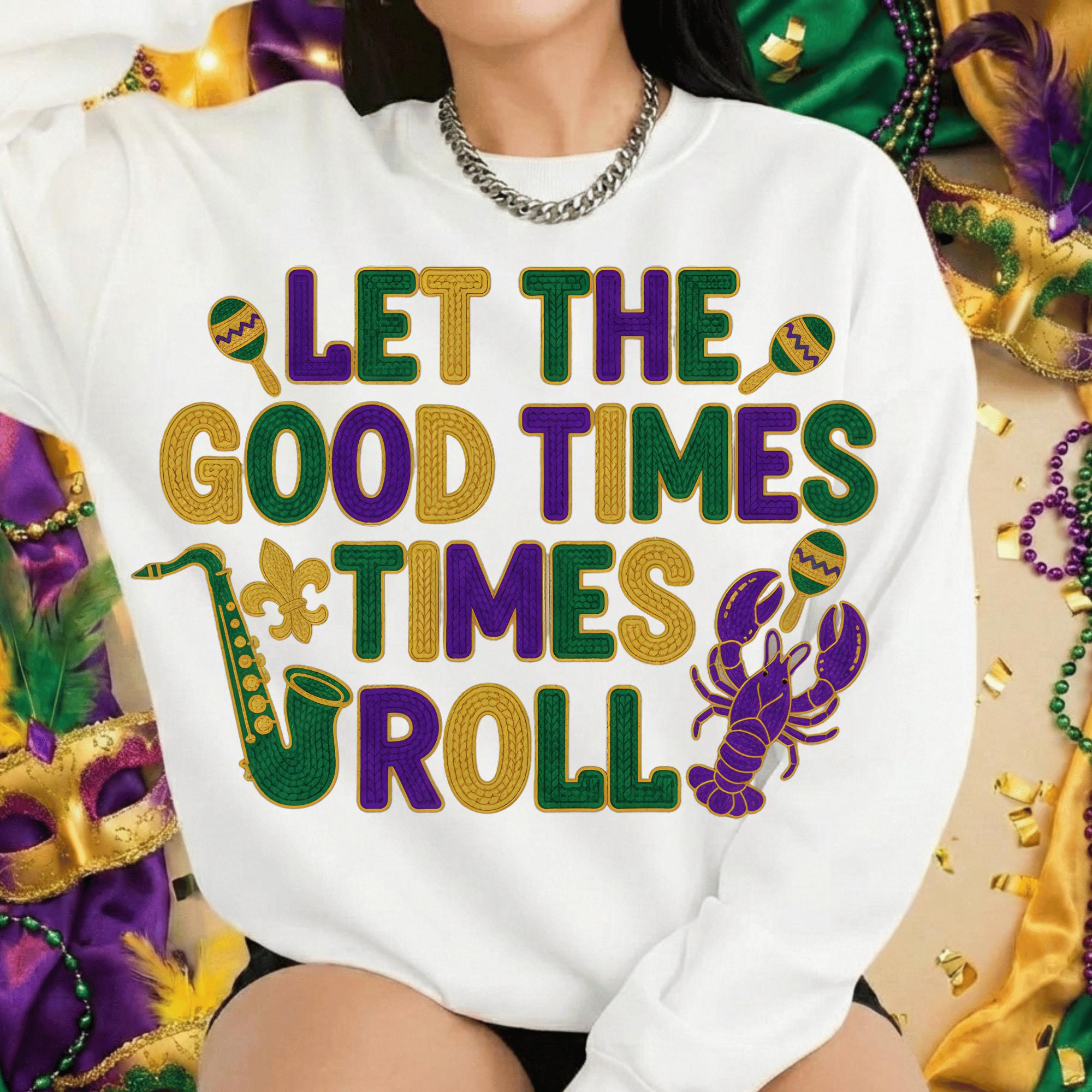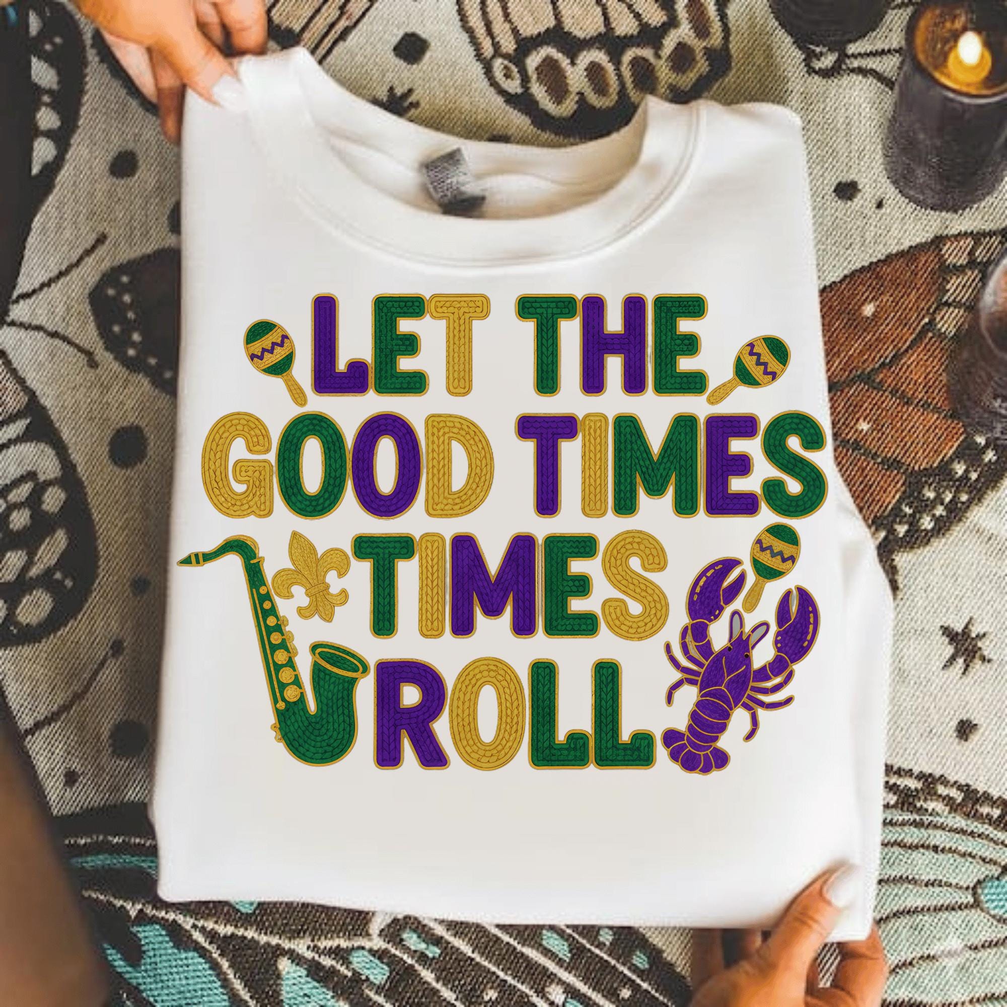 Celebrate Mardi Gras with this “Let The Good Times Roll” Mardi Gras PNG design in classic purple, green, and gold colors.