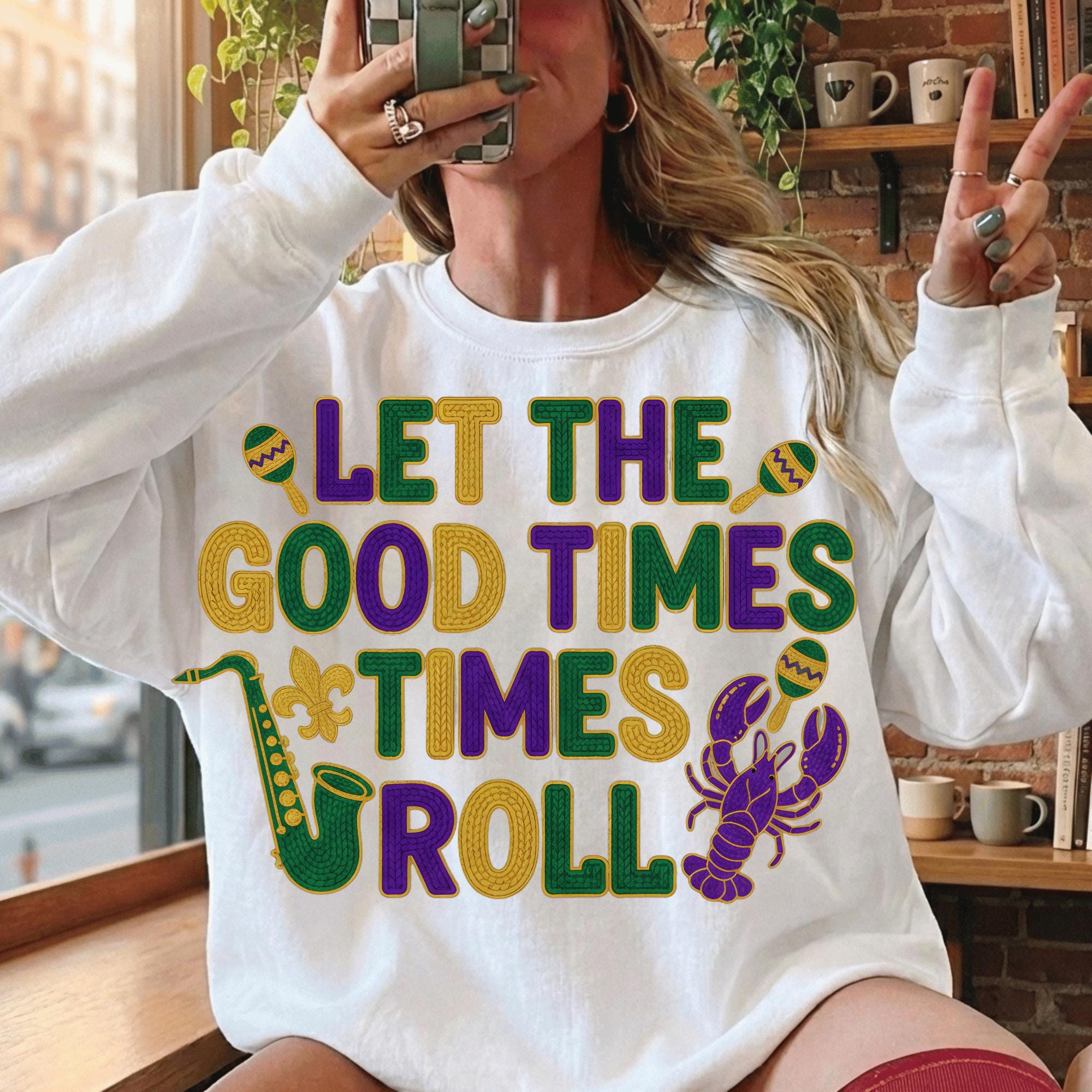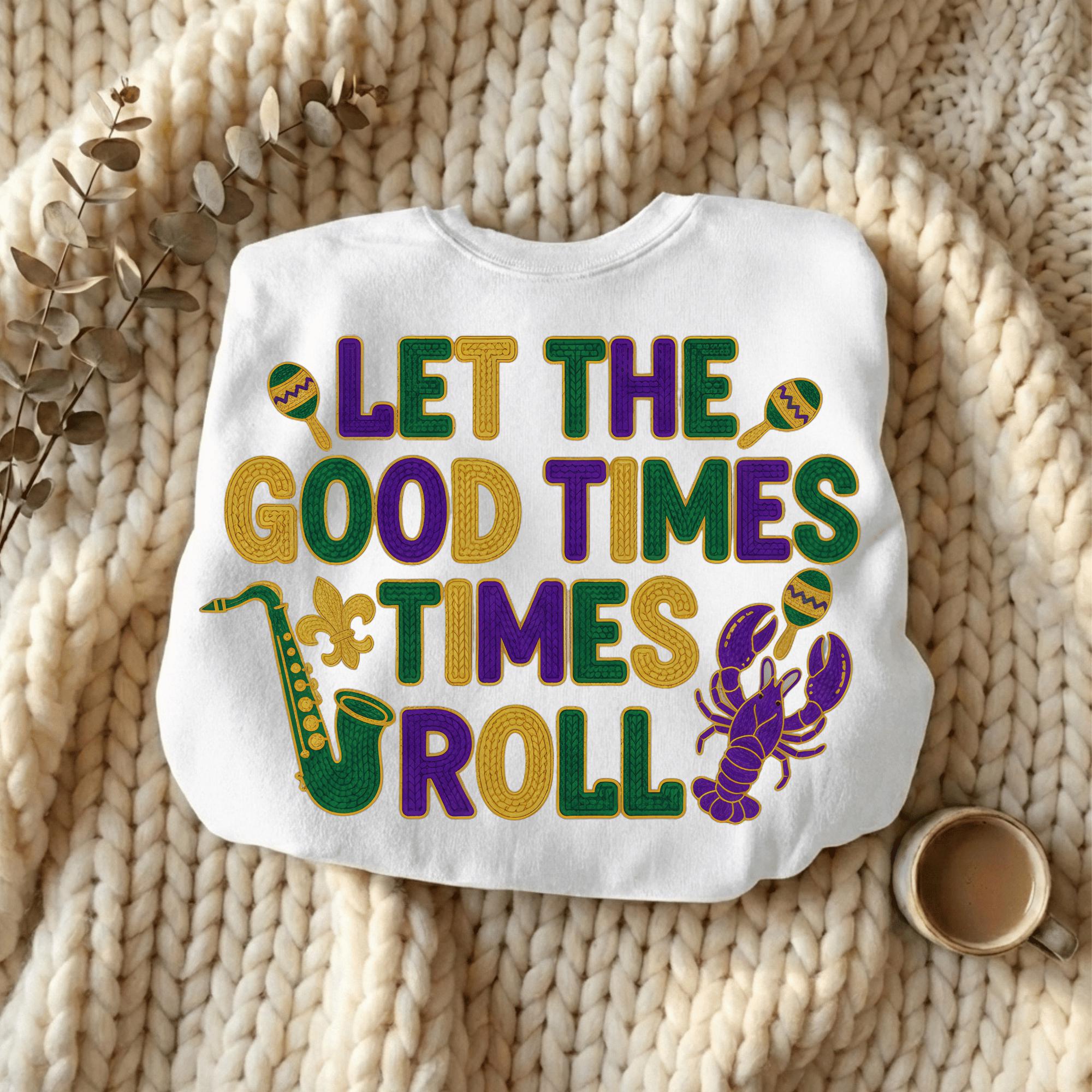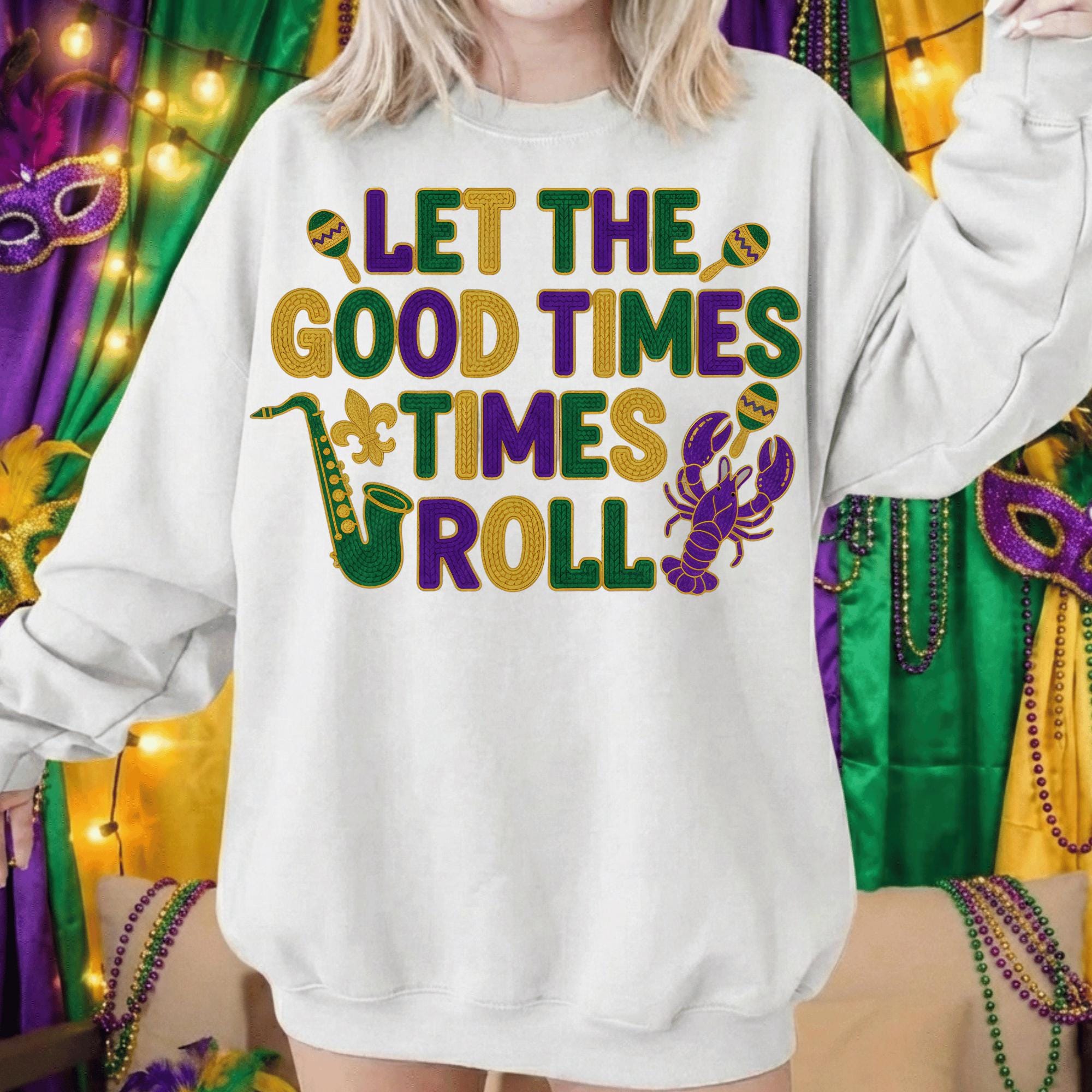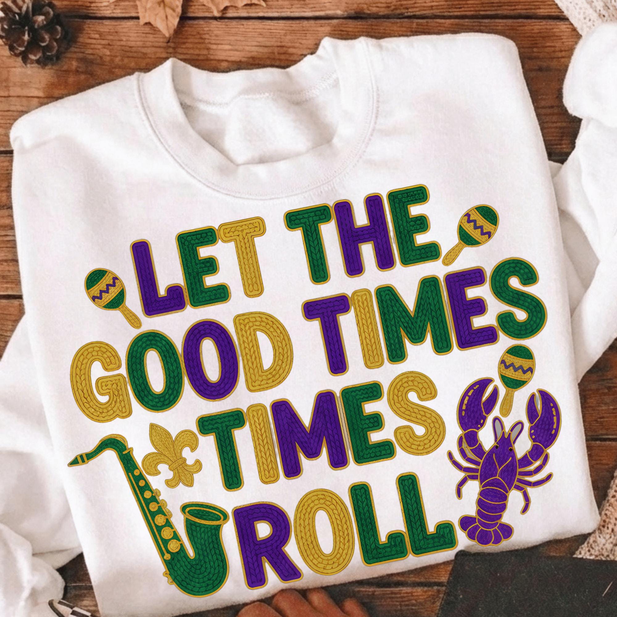 Celebrate Mardi Gras with this “Let The Good Times Roll” Mardi Gras PNG design in classic purple, green, and gold colors.