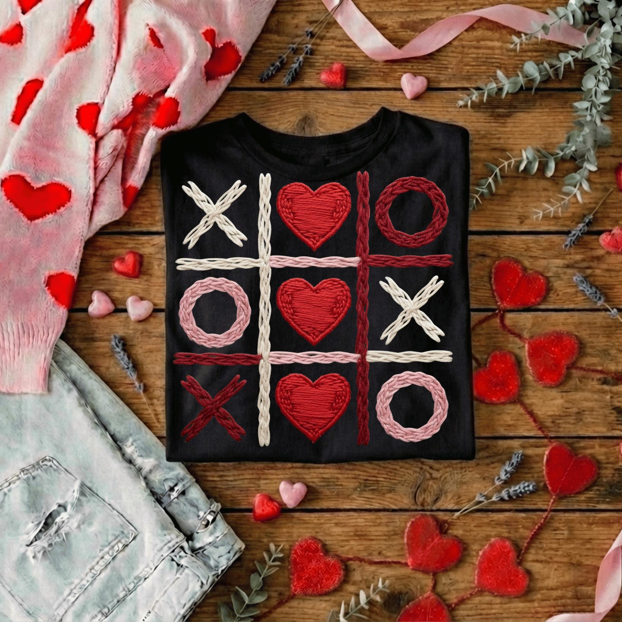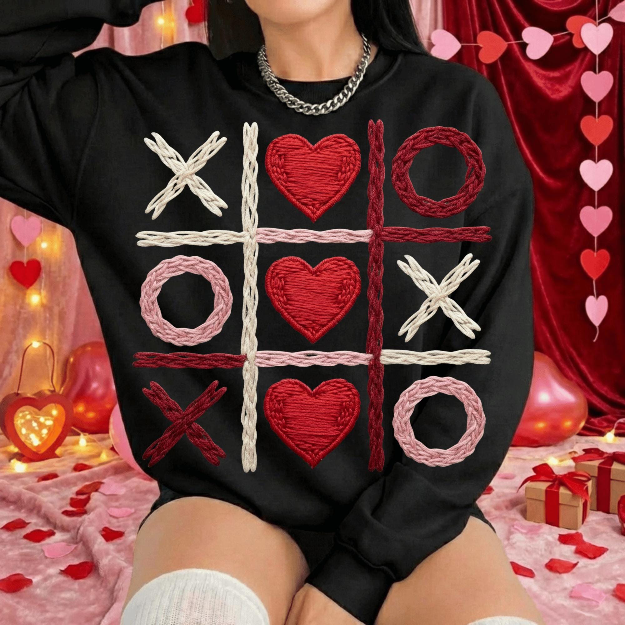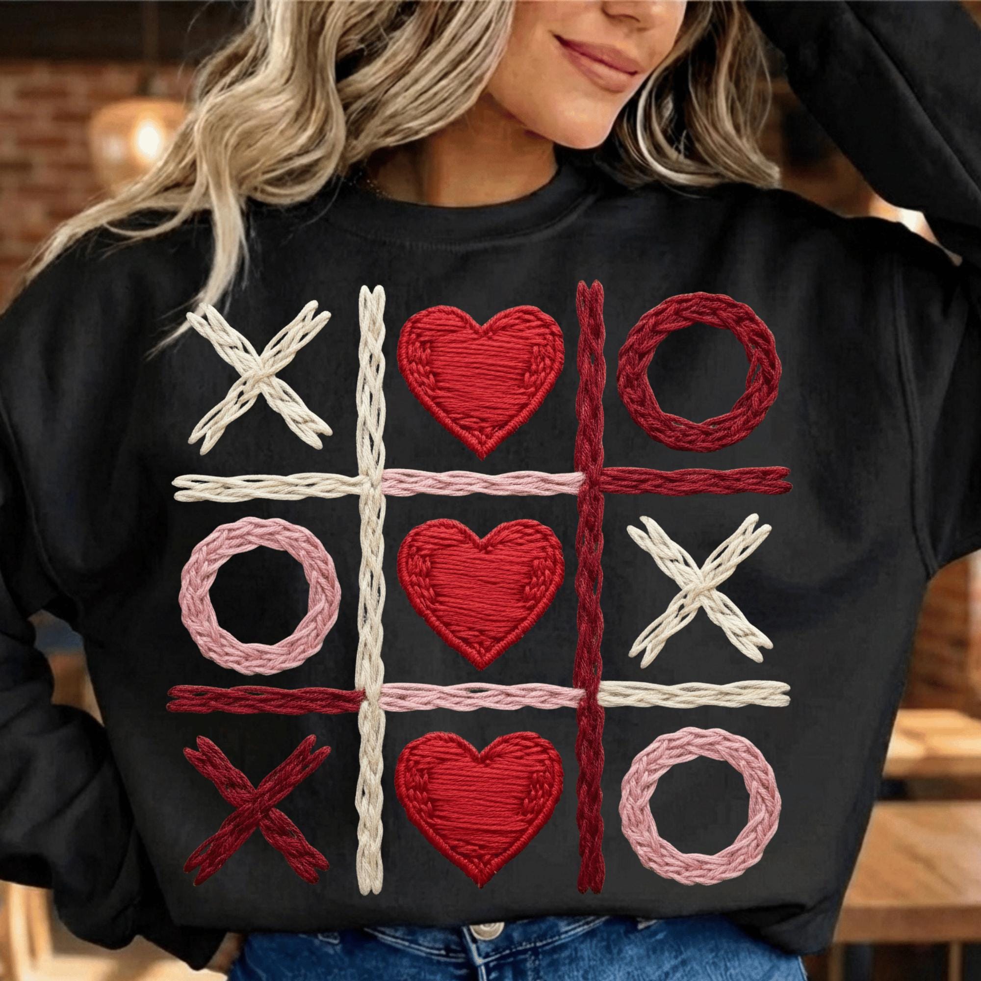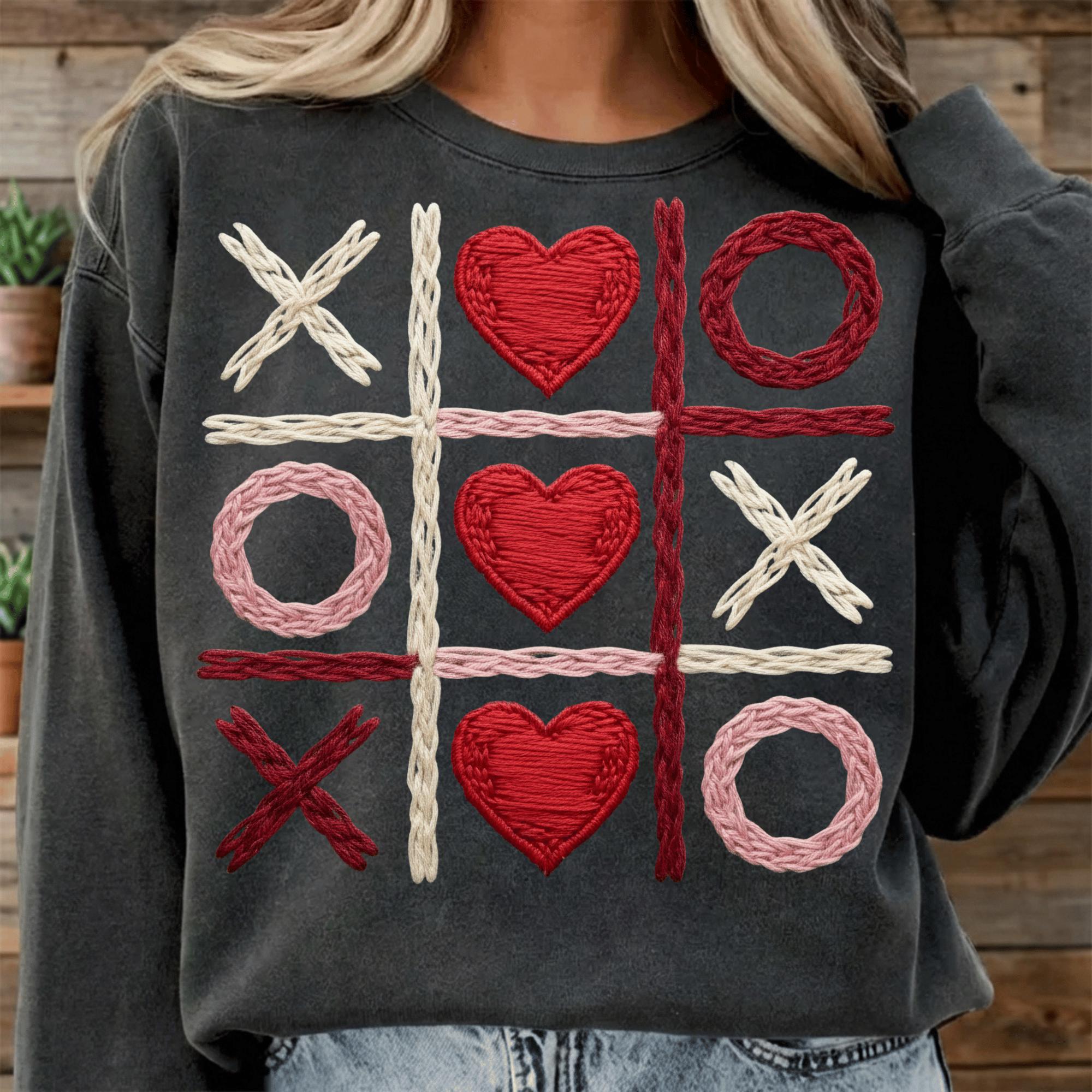 This Valentine Tic Tac Toe PNG features hearts and X-O shapes in a cozy stitched style, perfect for Valentine projects.