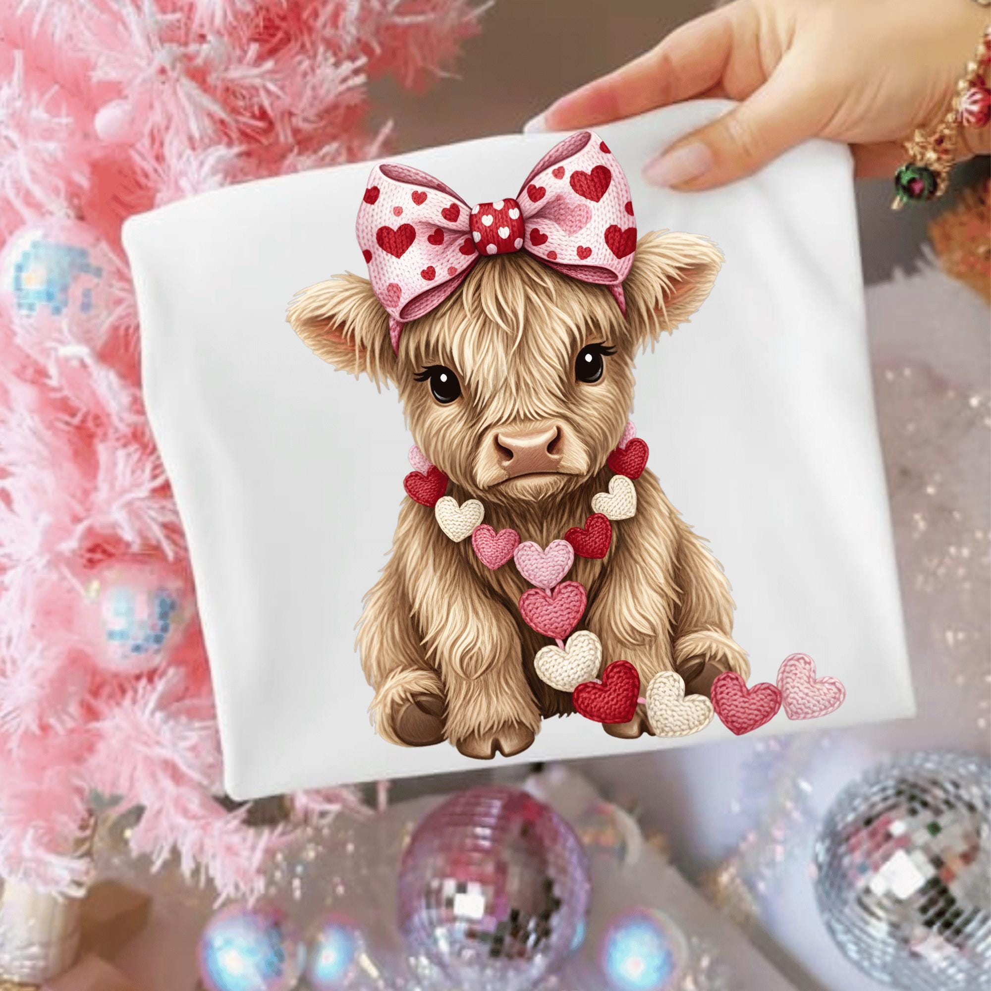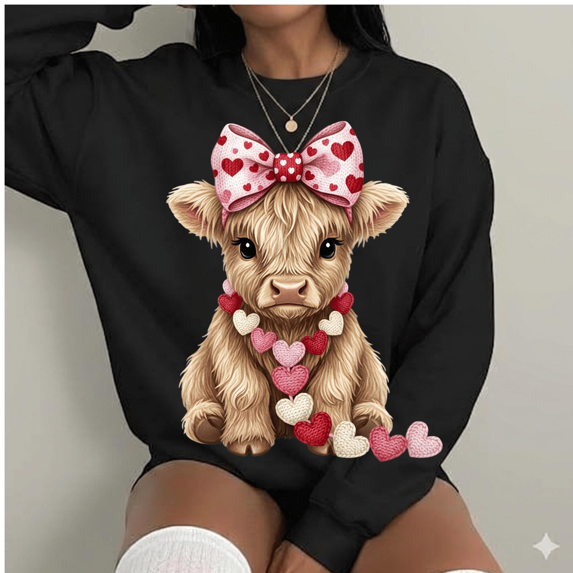 This Valentine Highland Cow PNG features a cute stacked highland cow design with bows, heart glasses, and soft Valentine colors.