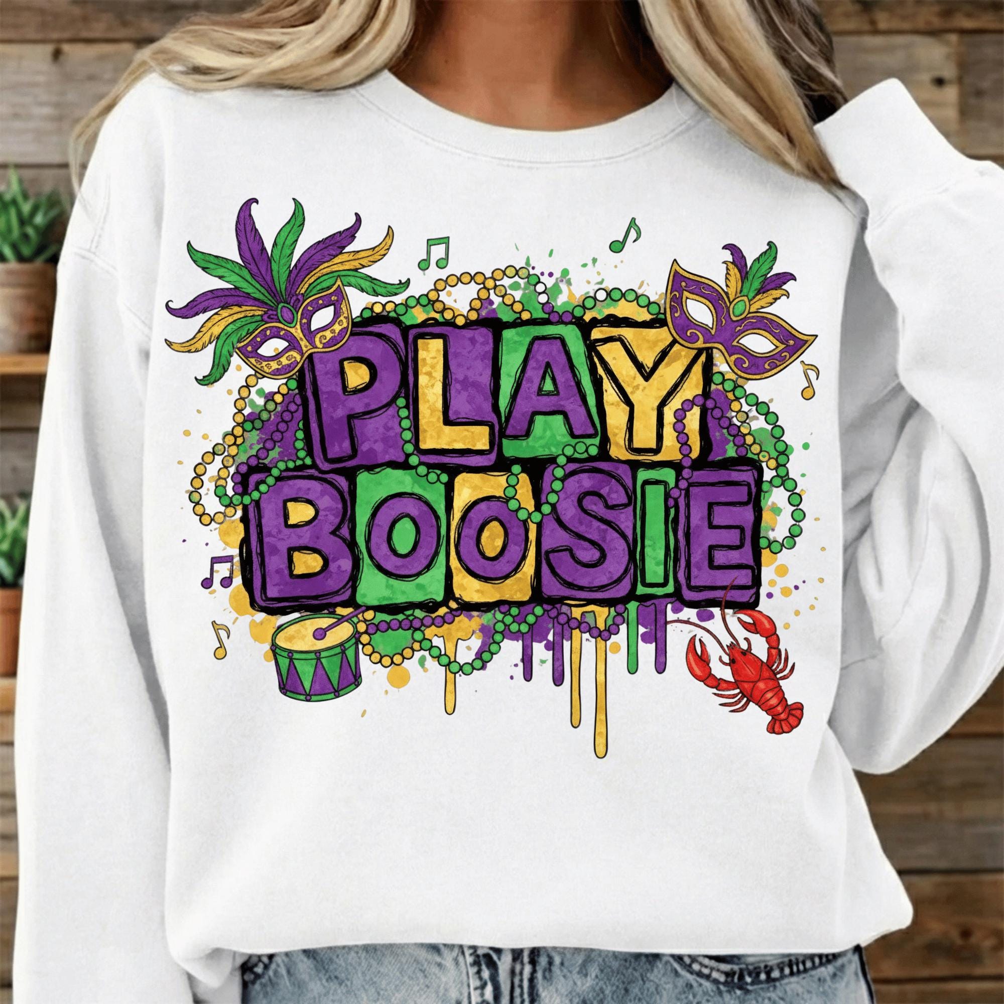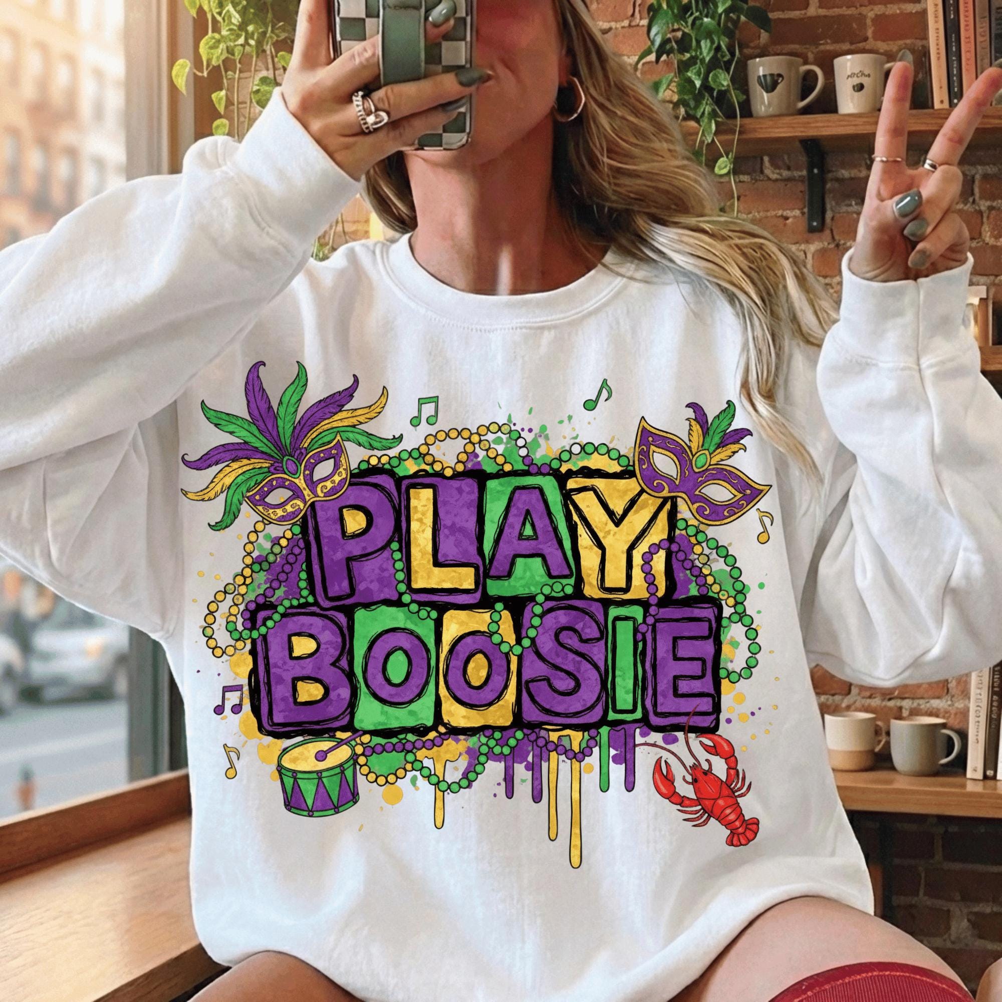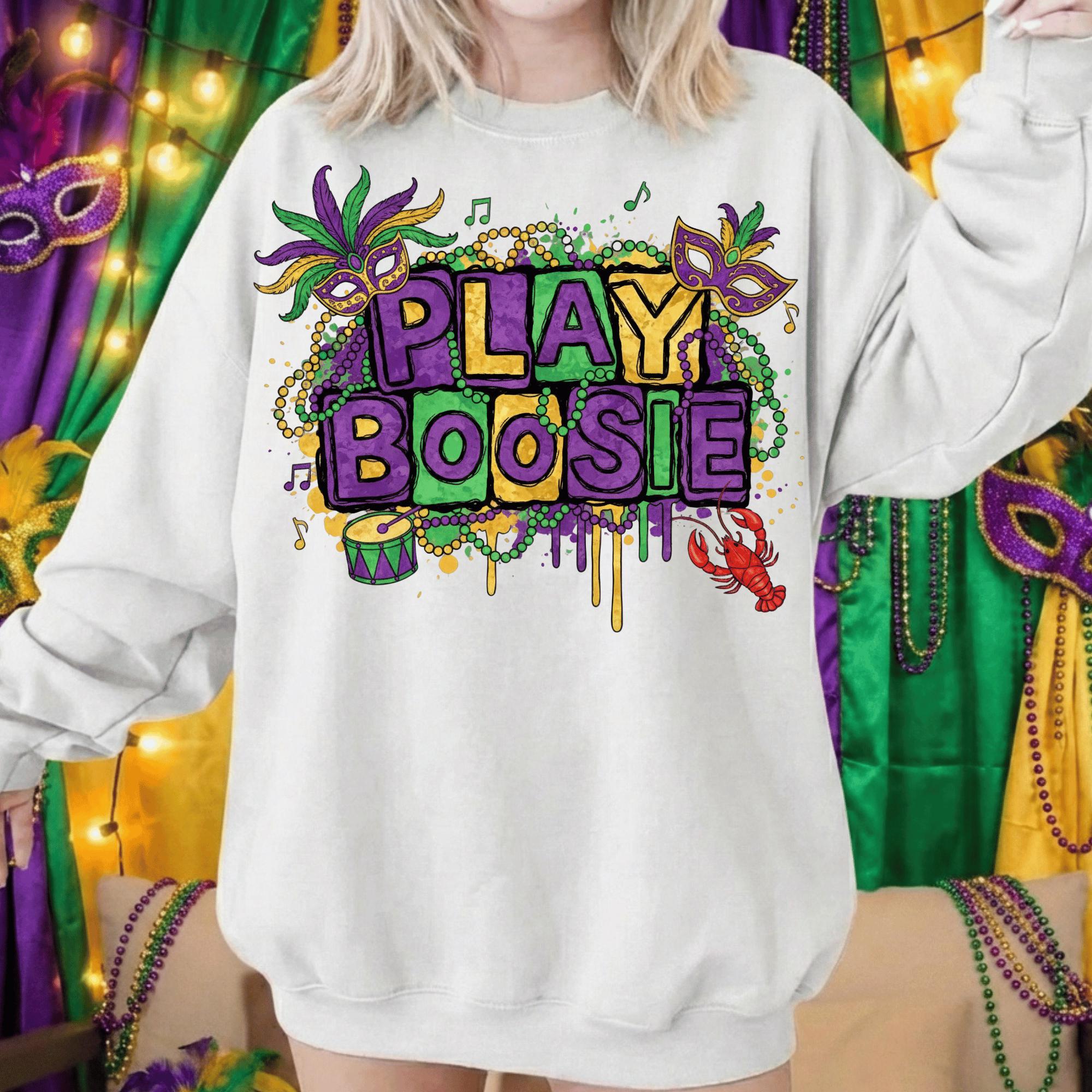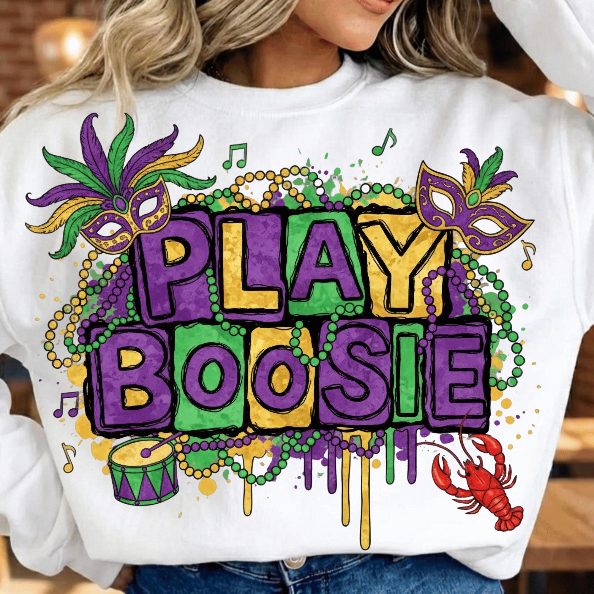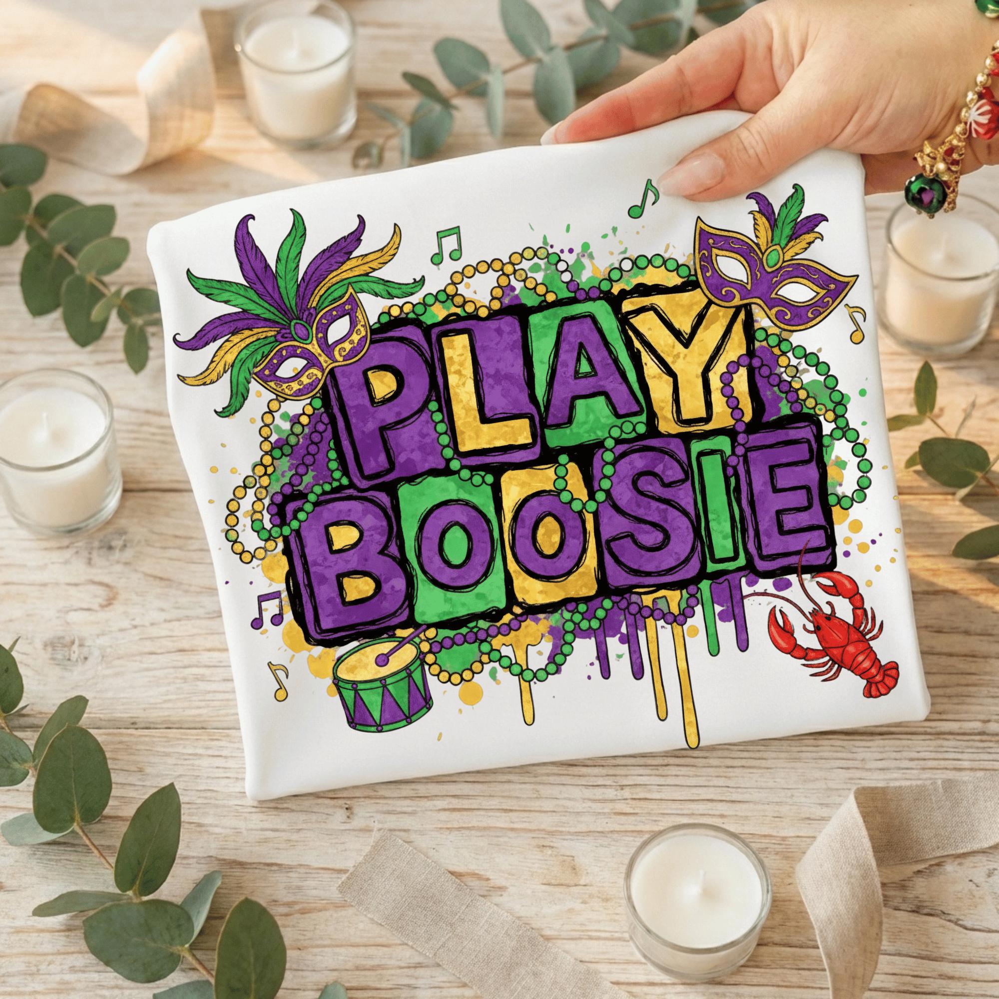 Celebrate Mardi Gras Louisiana style with this bold “Play Boosie” PNG design, inspired by New Orleans parade vibes, beads, masks, music, and crawfish. This design is perfect for customers searching for Mardi Gras shirts, Louisiana festival designs, or New Orleans party PNGs.