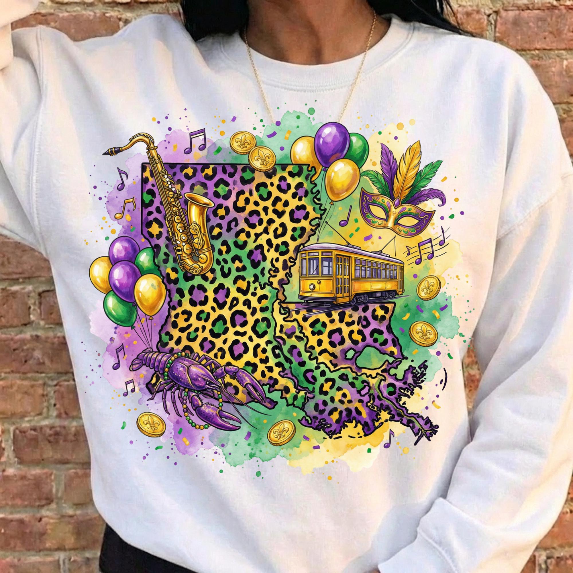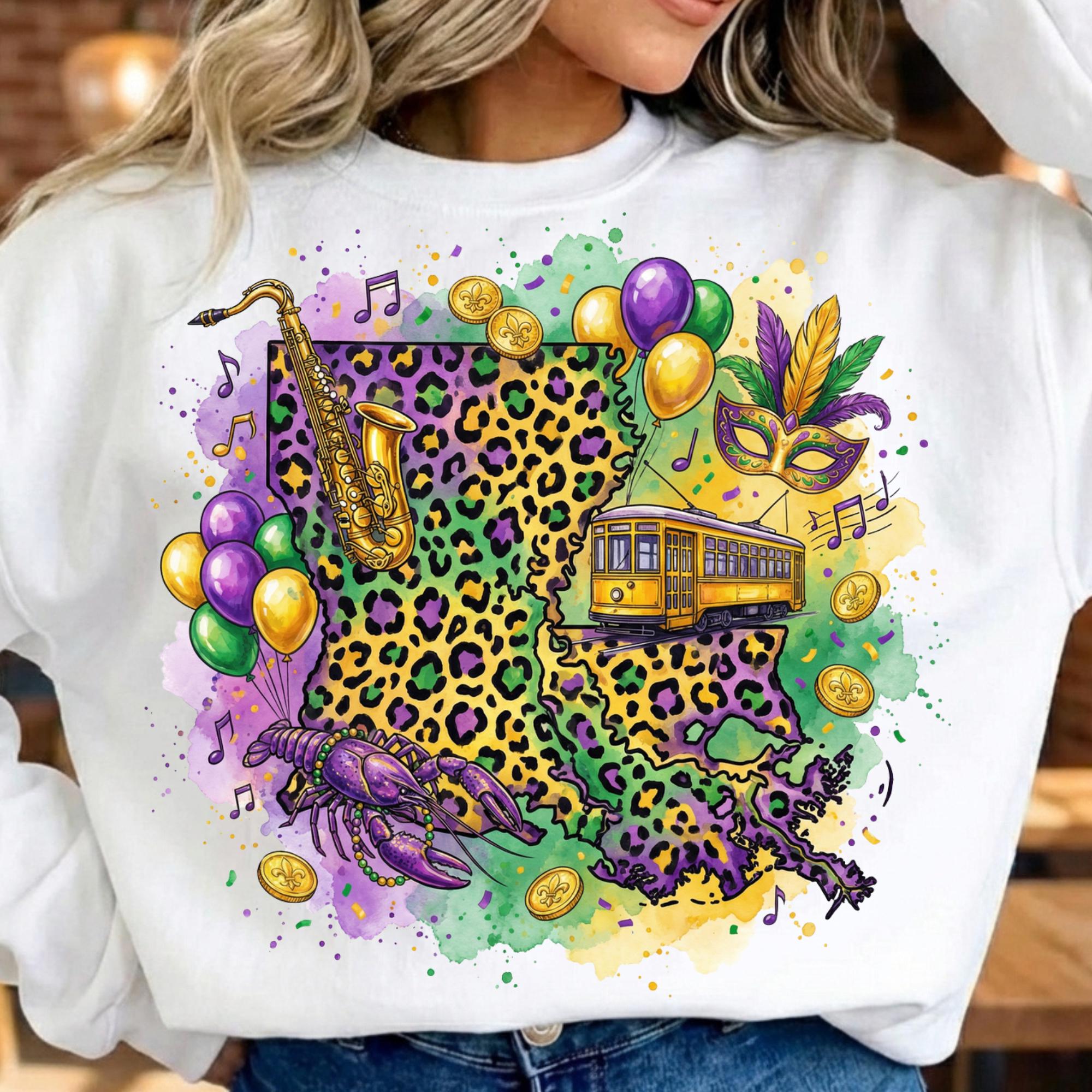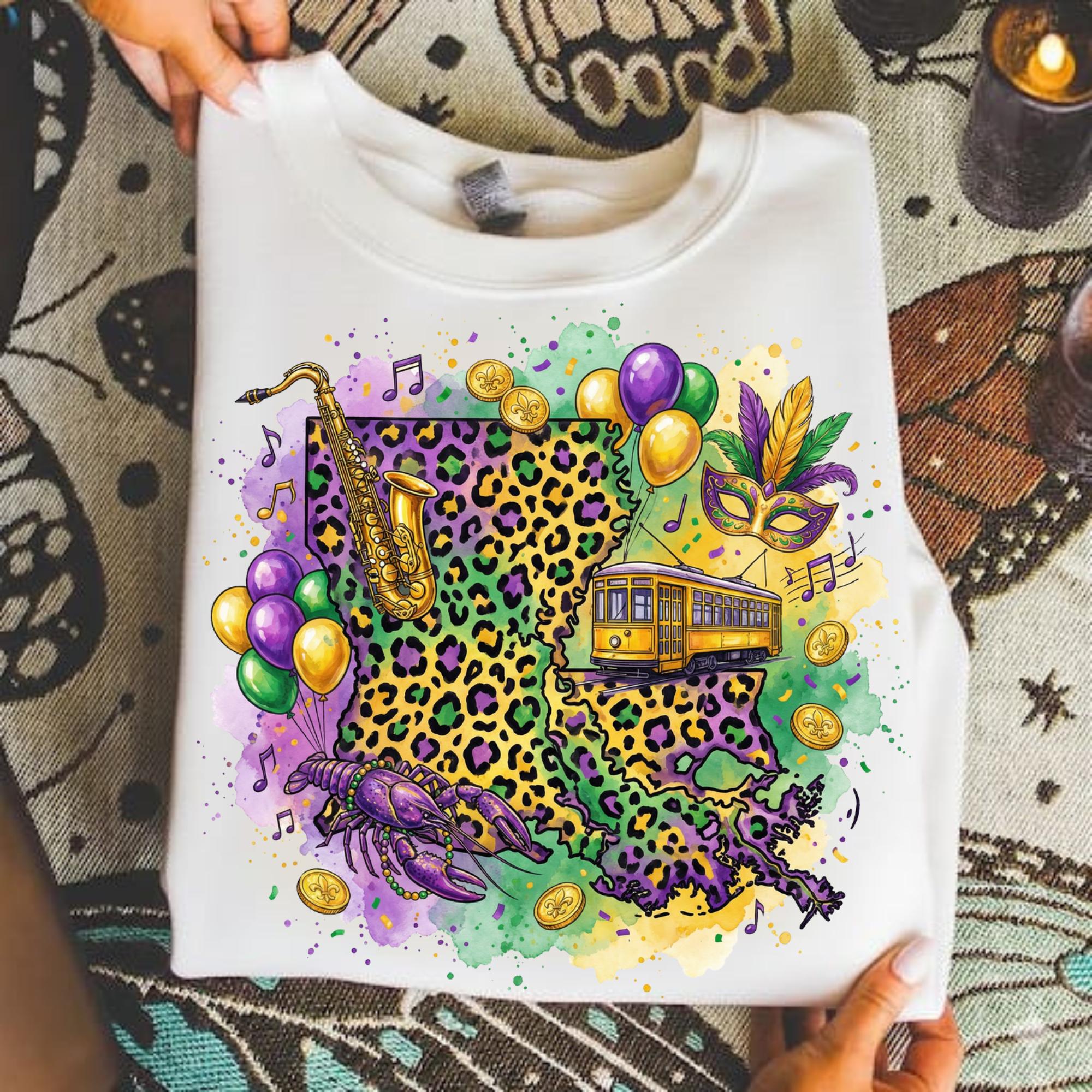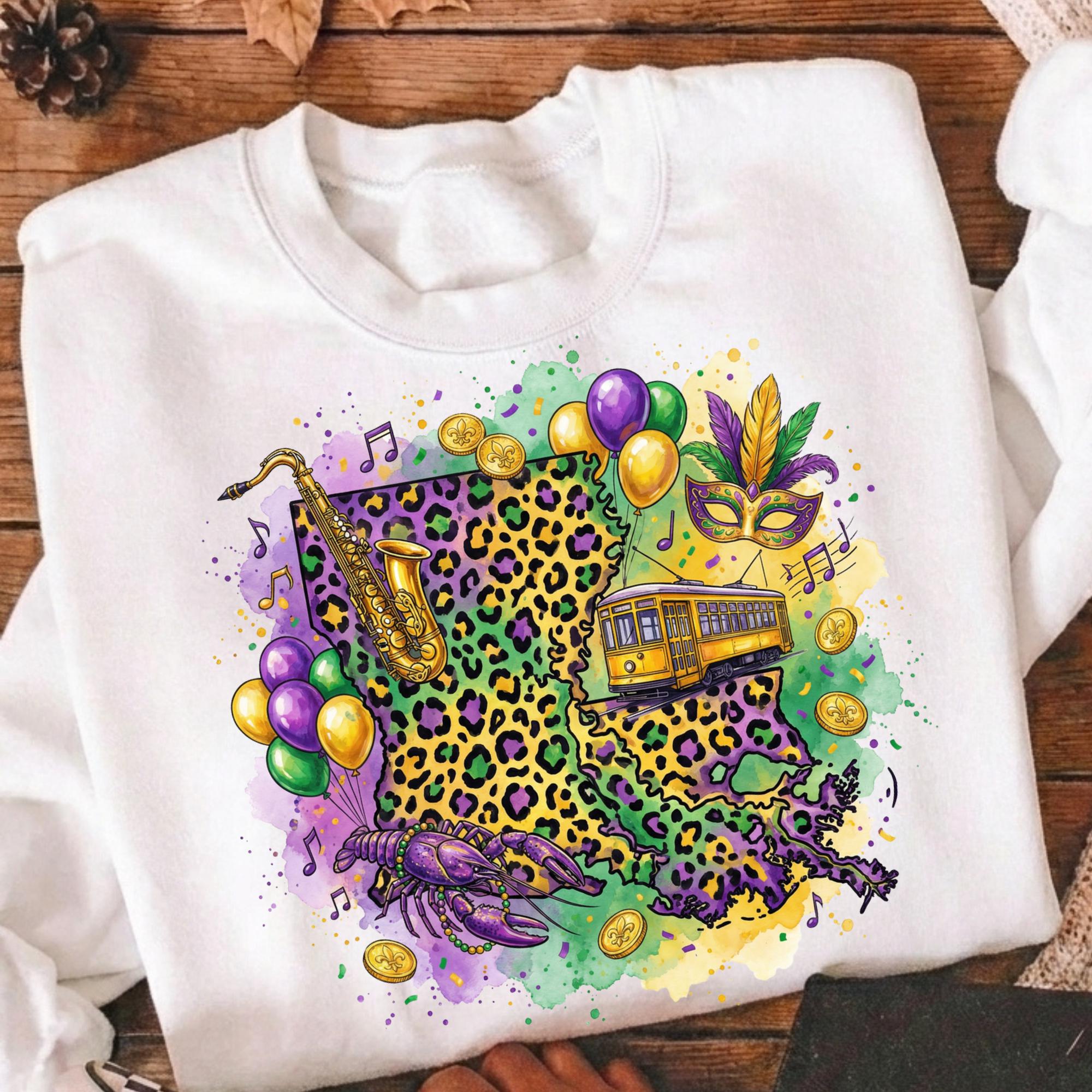 Celebrate Louisiana culture with this Louisiana Mardi Gras PNG design, featuring a vibrant state shape filled with New Orleans streetcar, beads, saxophone, mask, coins, and Mardi Gras colors. Perfect for customers searching for Louisiana Mardi Gras shirts, New Orleans parade designs, and festival sublimation graphics.