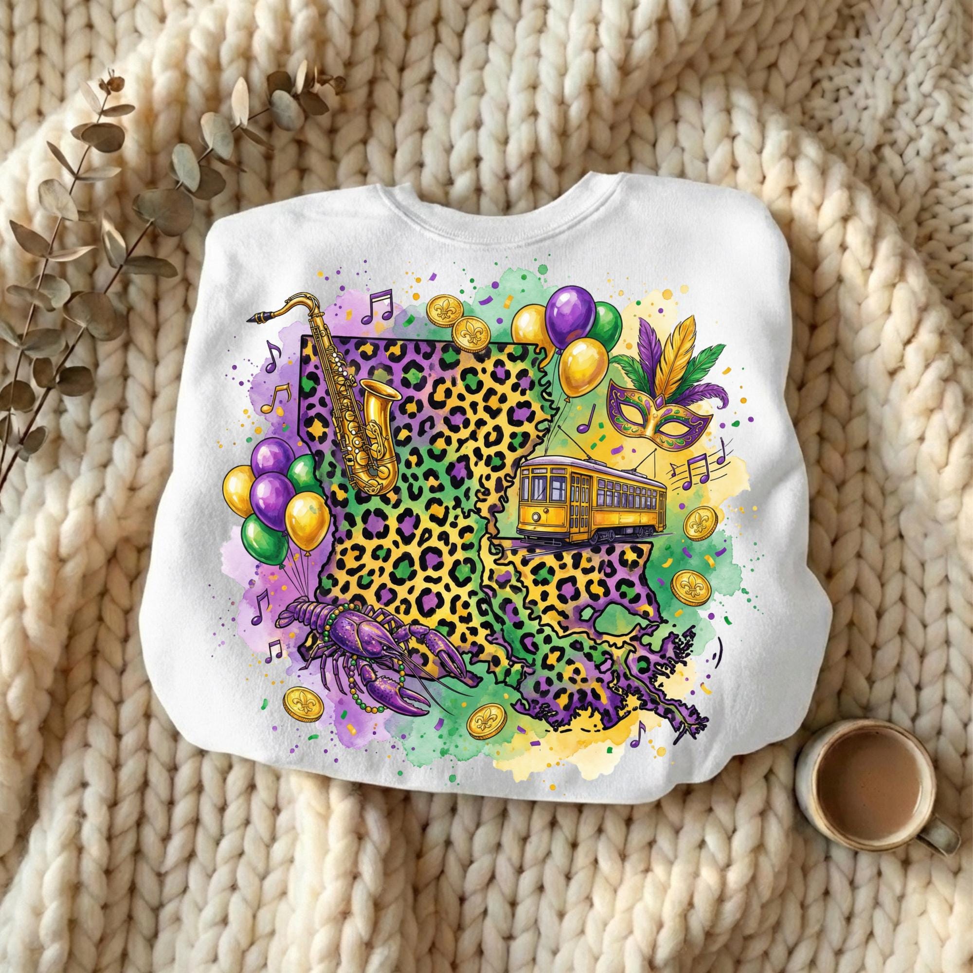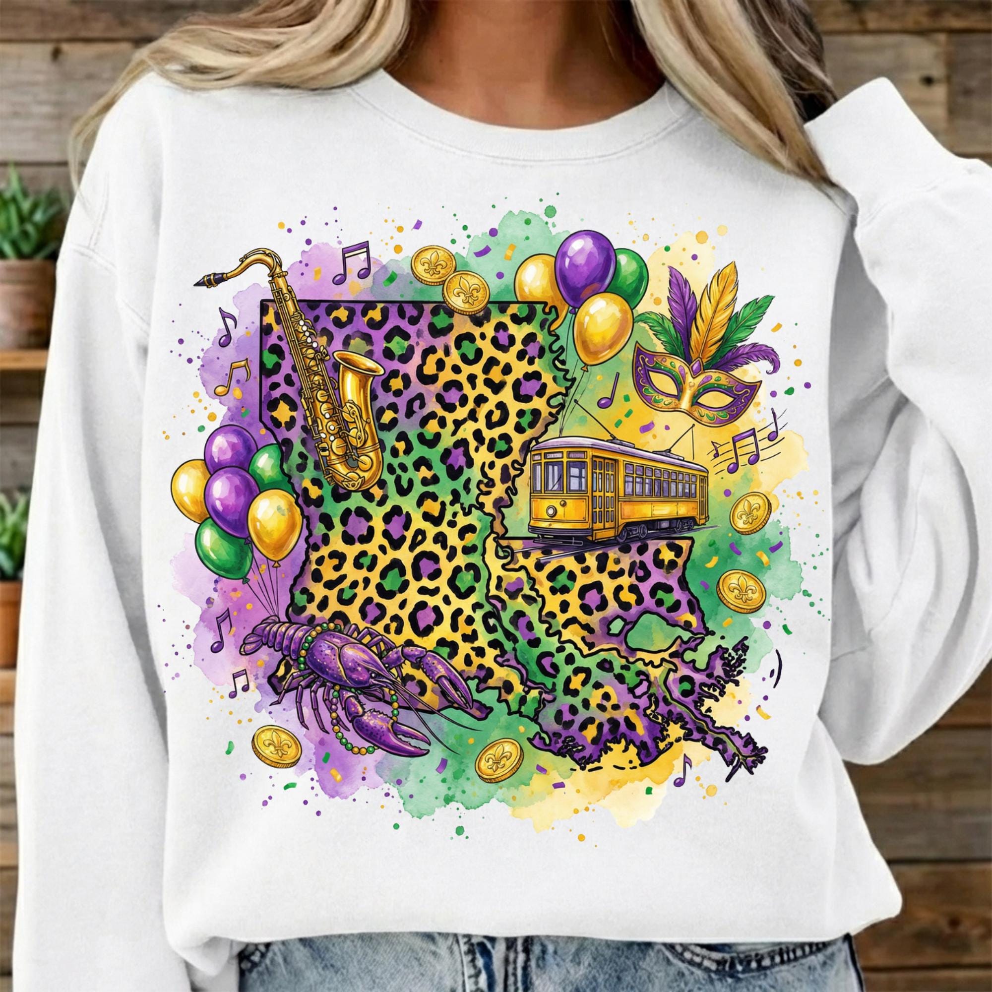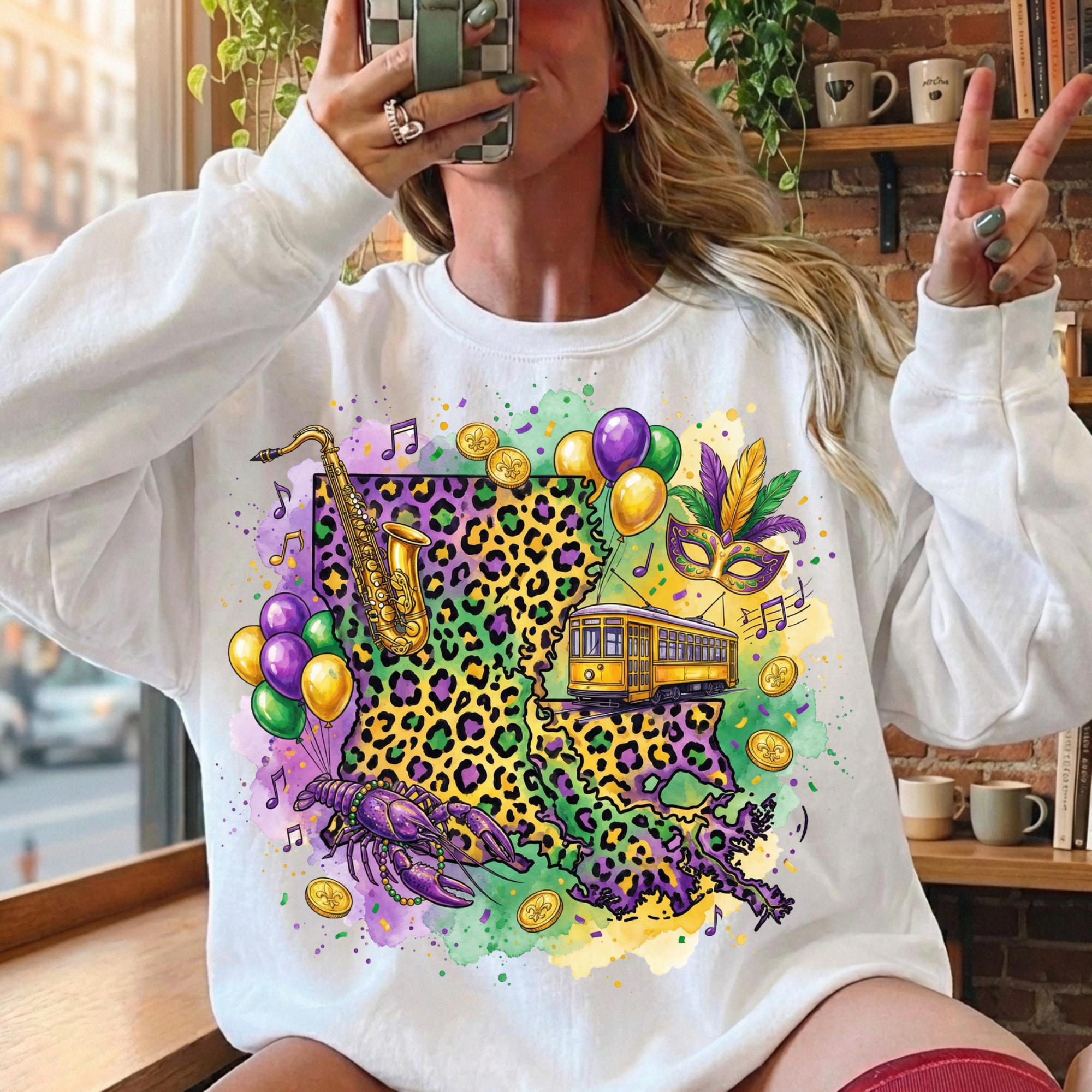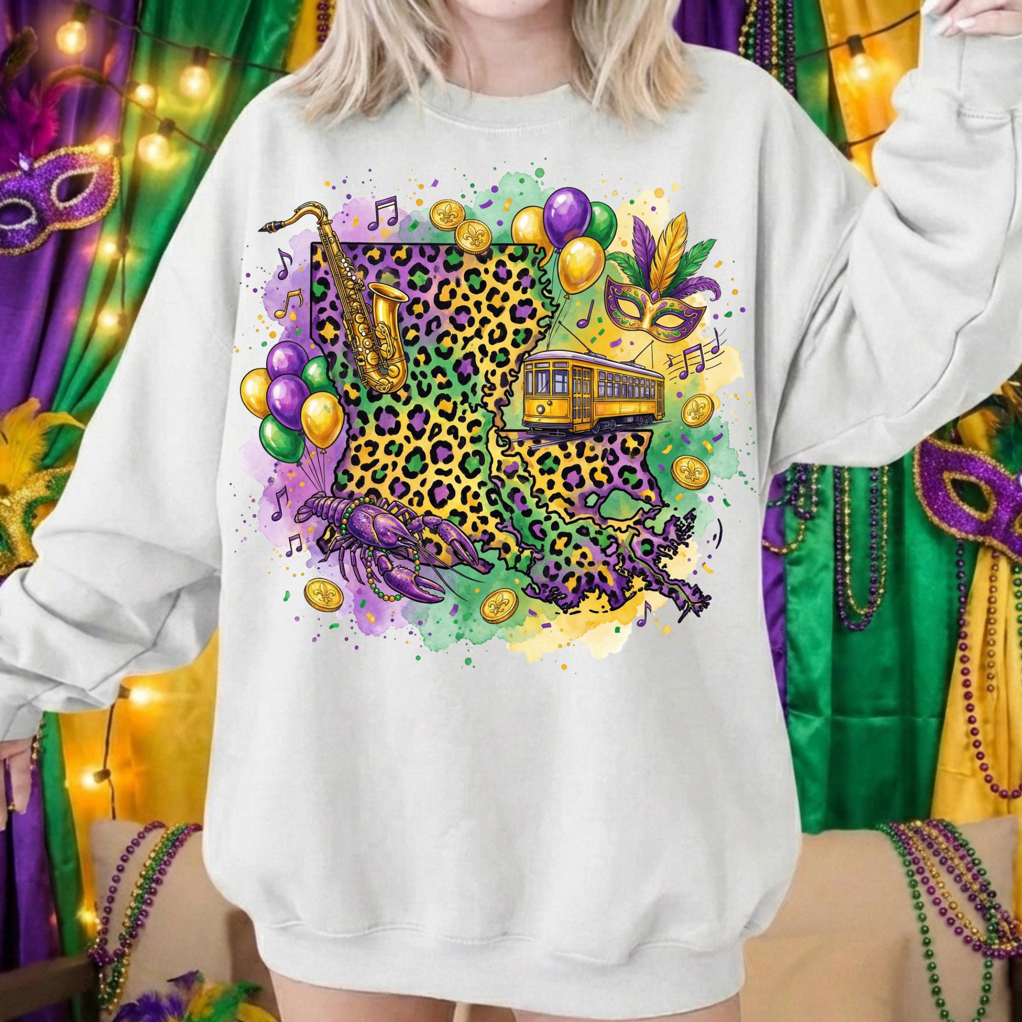Celebrate Louisiana culture with this Louisiana Mardi Gras PNG design, featuring a vibrant state shape filled with New Orleans streetcar, beads, saxophone, mask, coins, and Mardi Gras colors. Perfect for customers searching for Louisiana Mardi Gras shirts, New Orleans parade designs, and festival sublimation graphics.