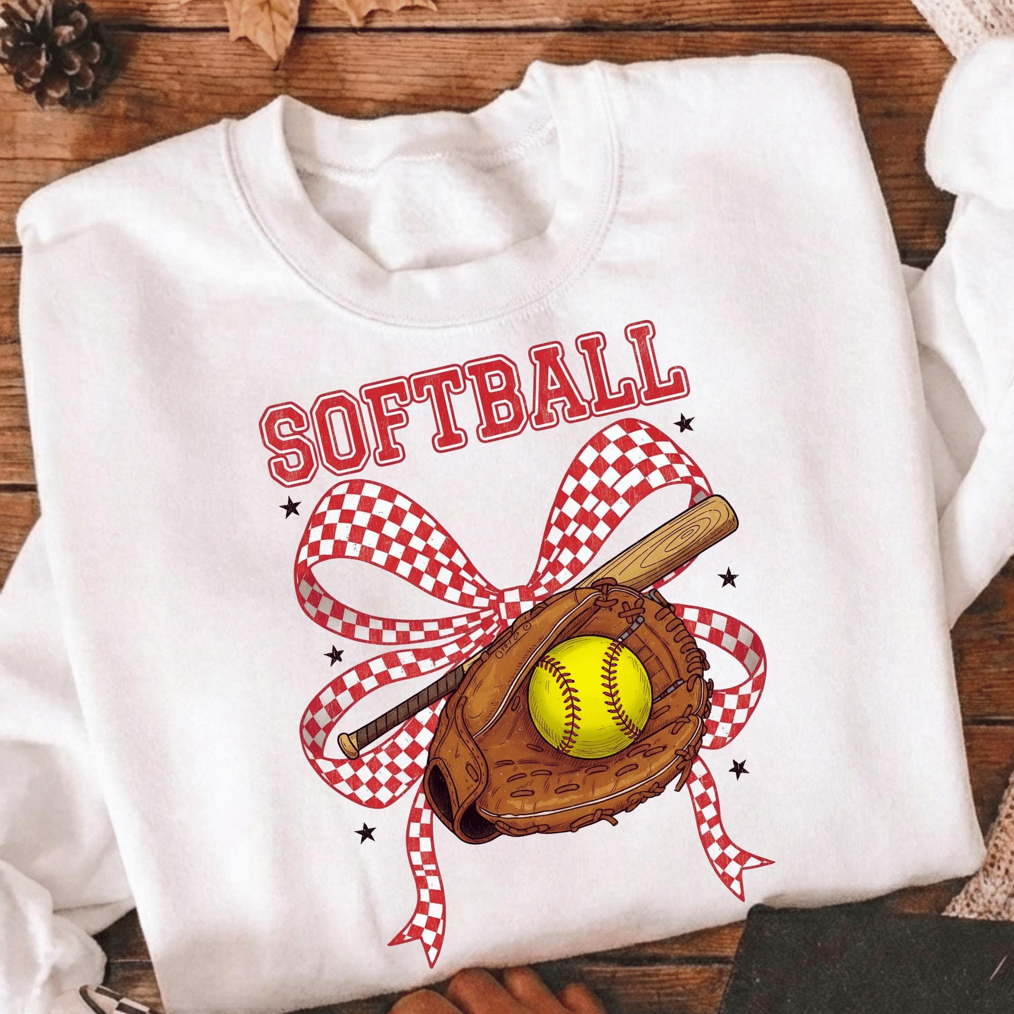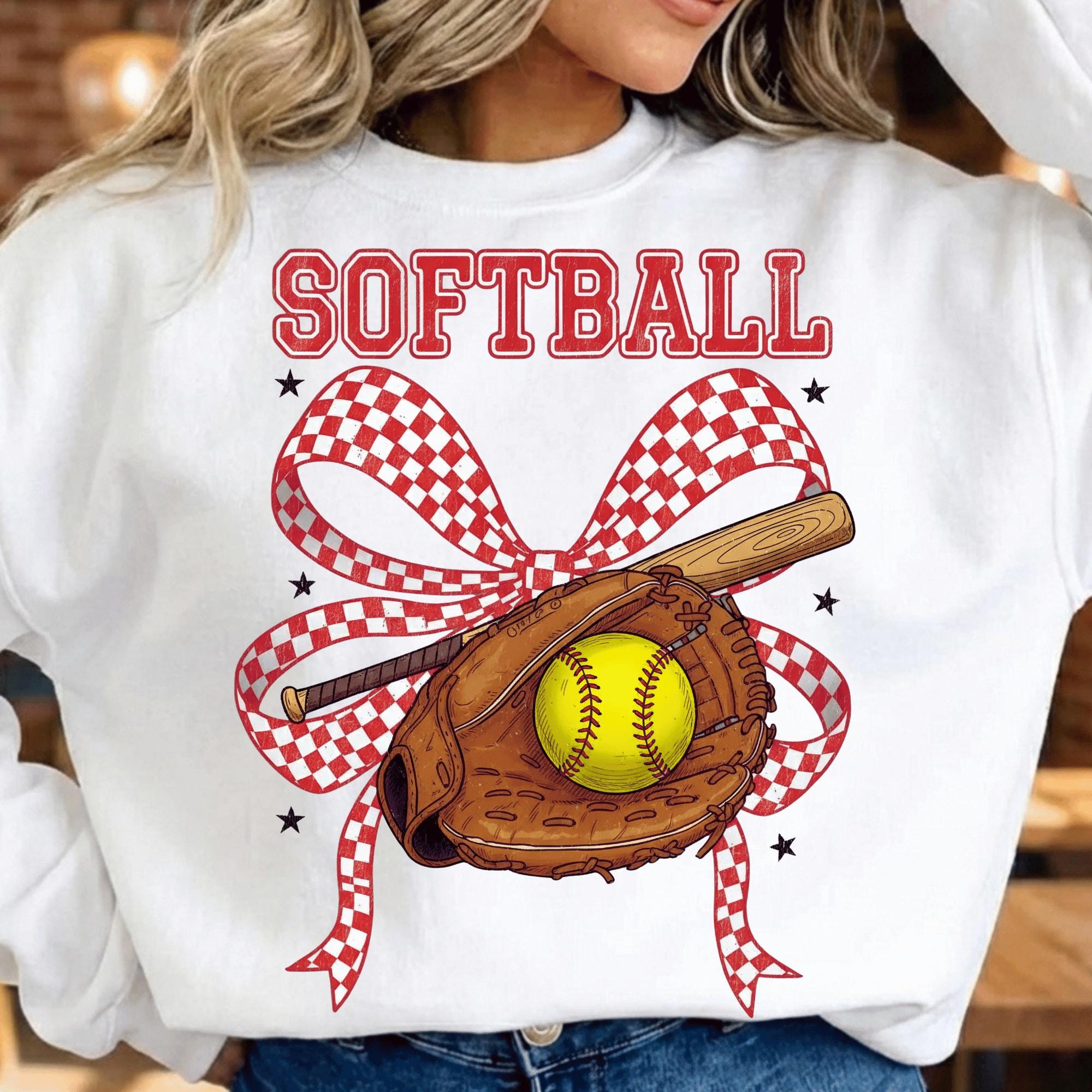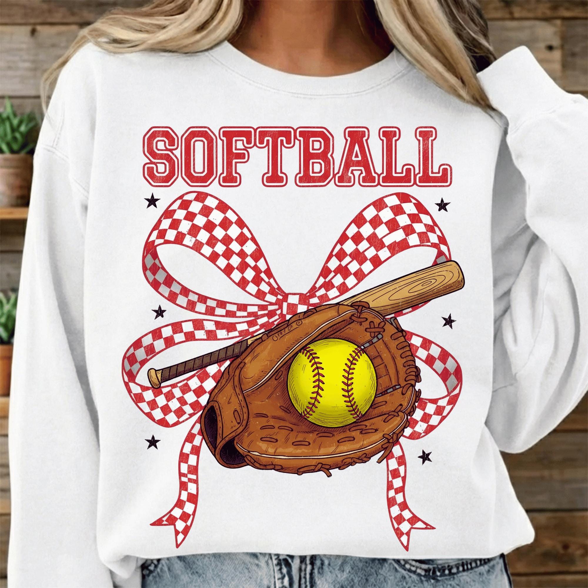 This Softball PNG features a classic softball glove, bat, ball, and red checkered bow, making it perfect for softball moms, players, teams, and game day shirts. Designed for sublimation, DTF, and heat press projects, this file is ideal for creating softball apparel and accessories.